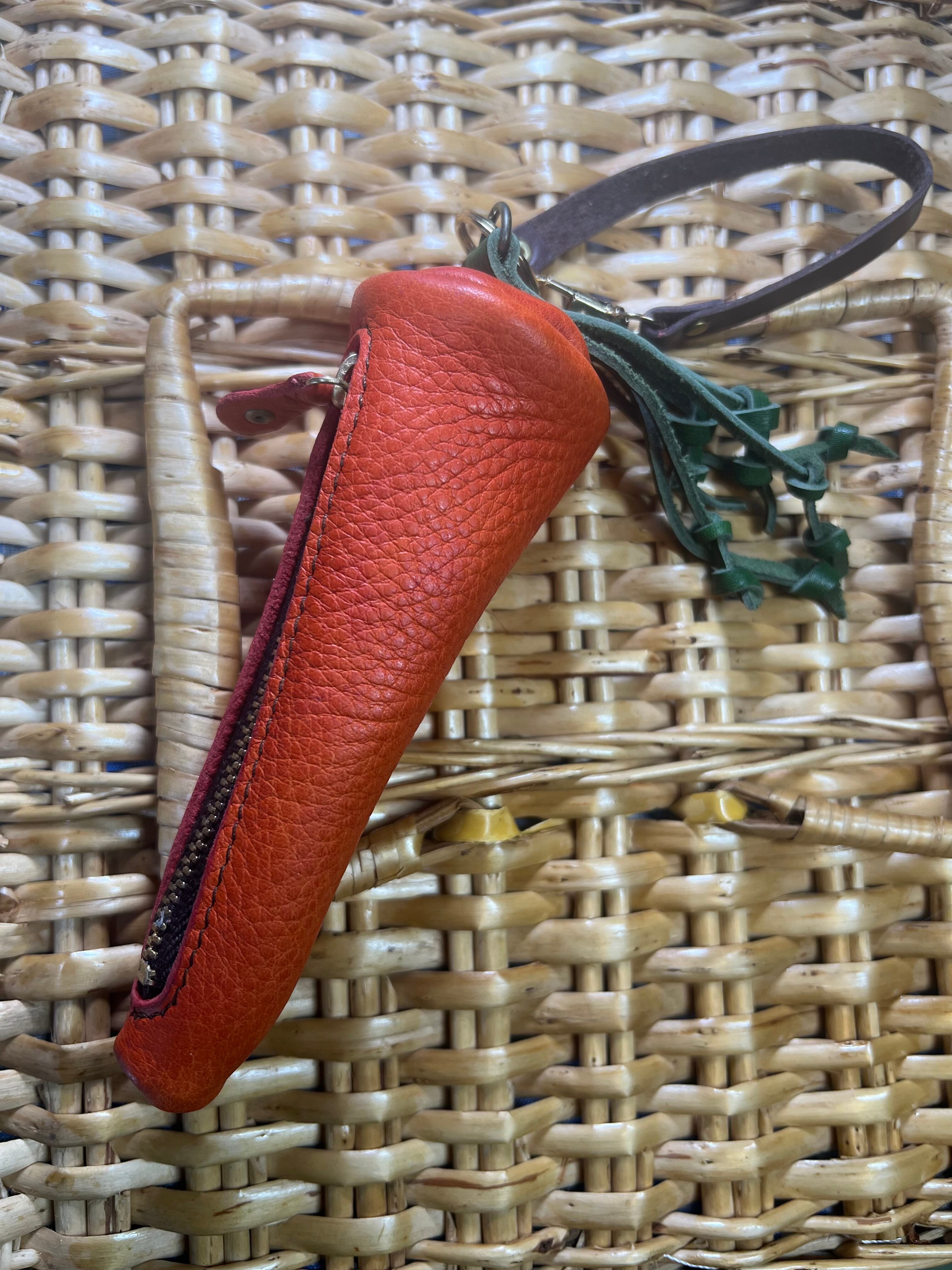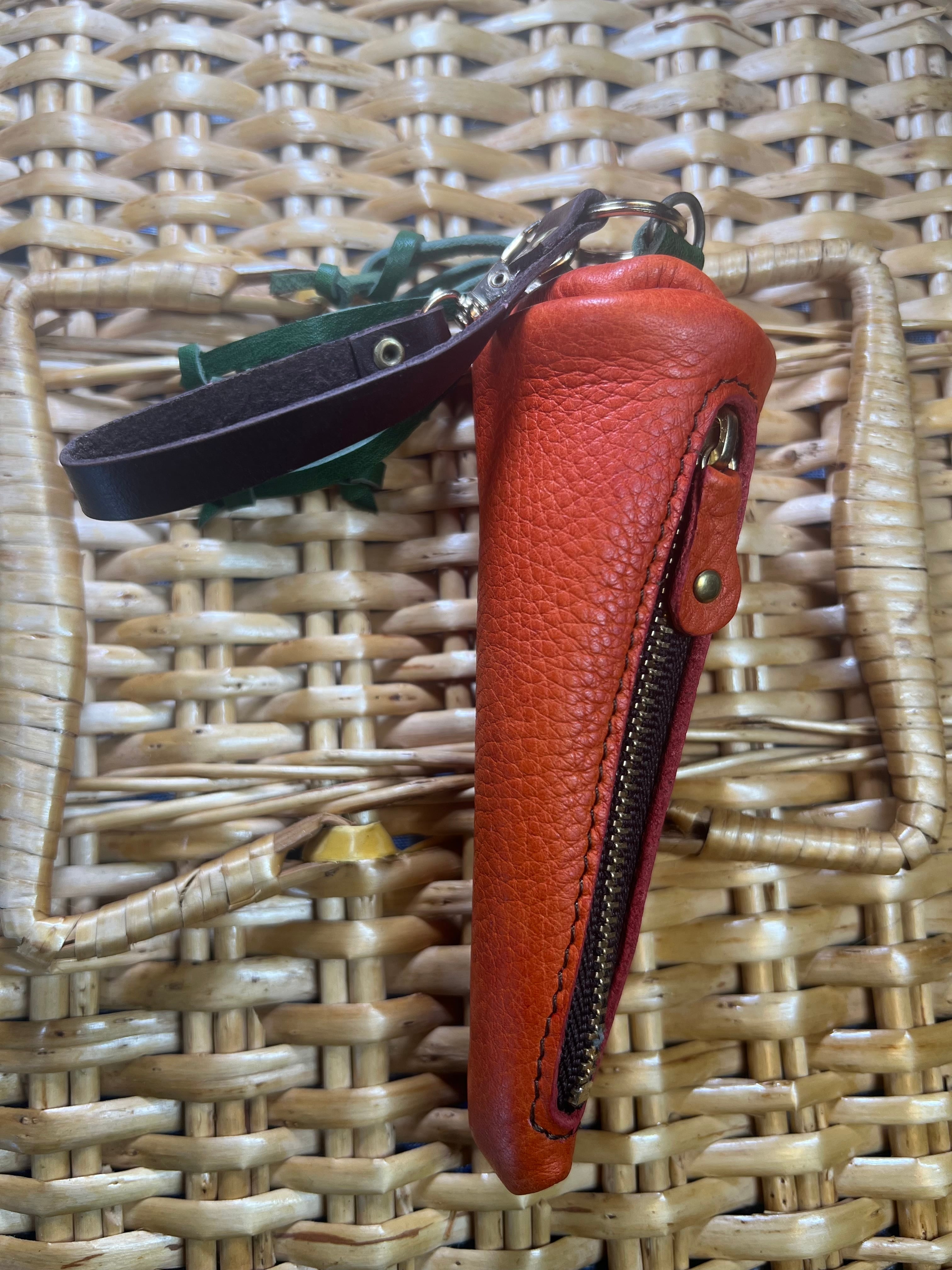 オレンジ色の柔らかい牛シュリンクレザーで作っています。サイズが縦横約13cmマチが5cm〜3cmです。写真が原物です。ファスナーはYKK10cmです