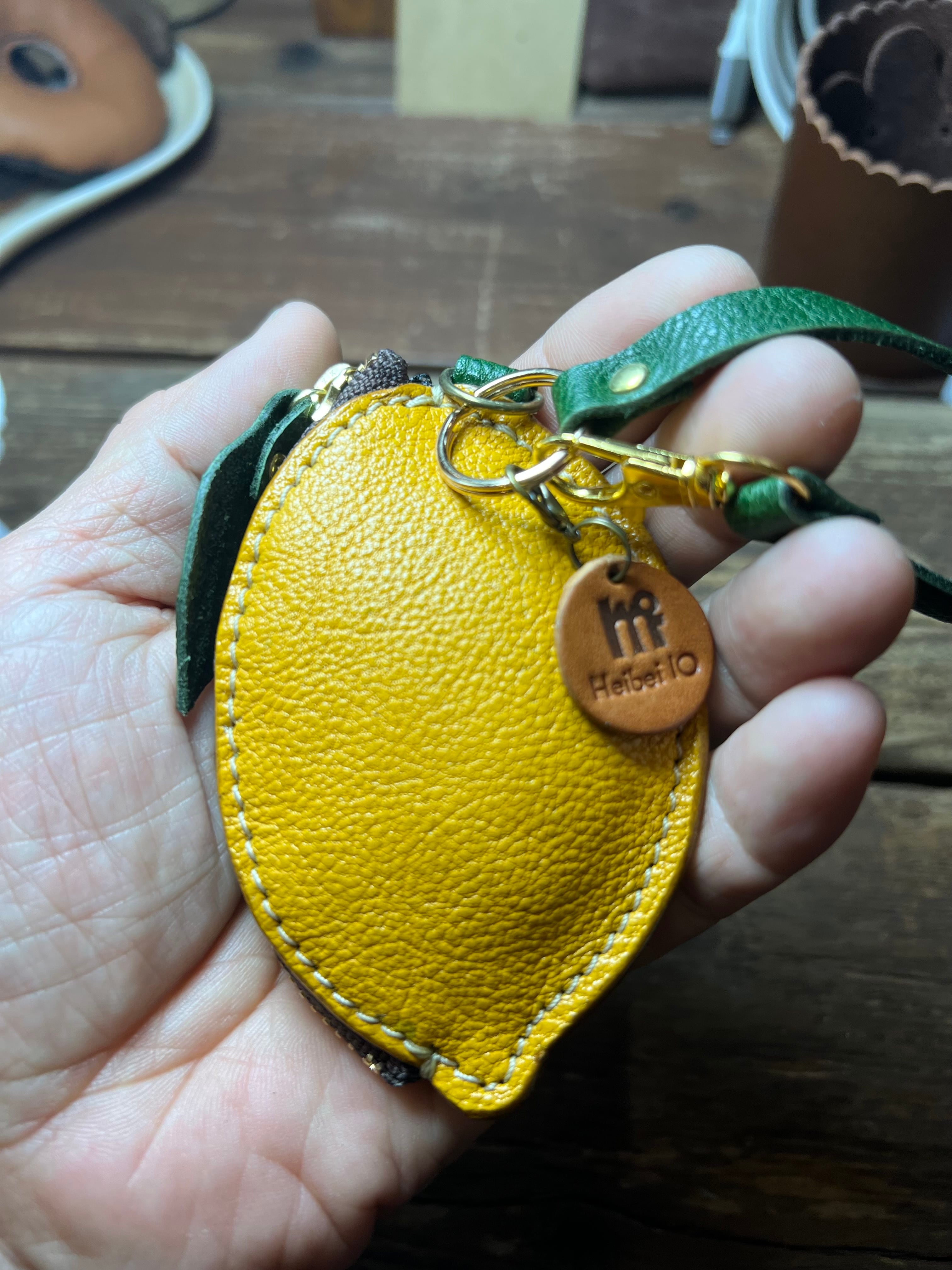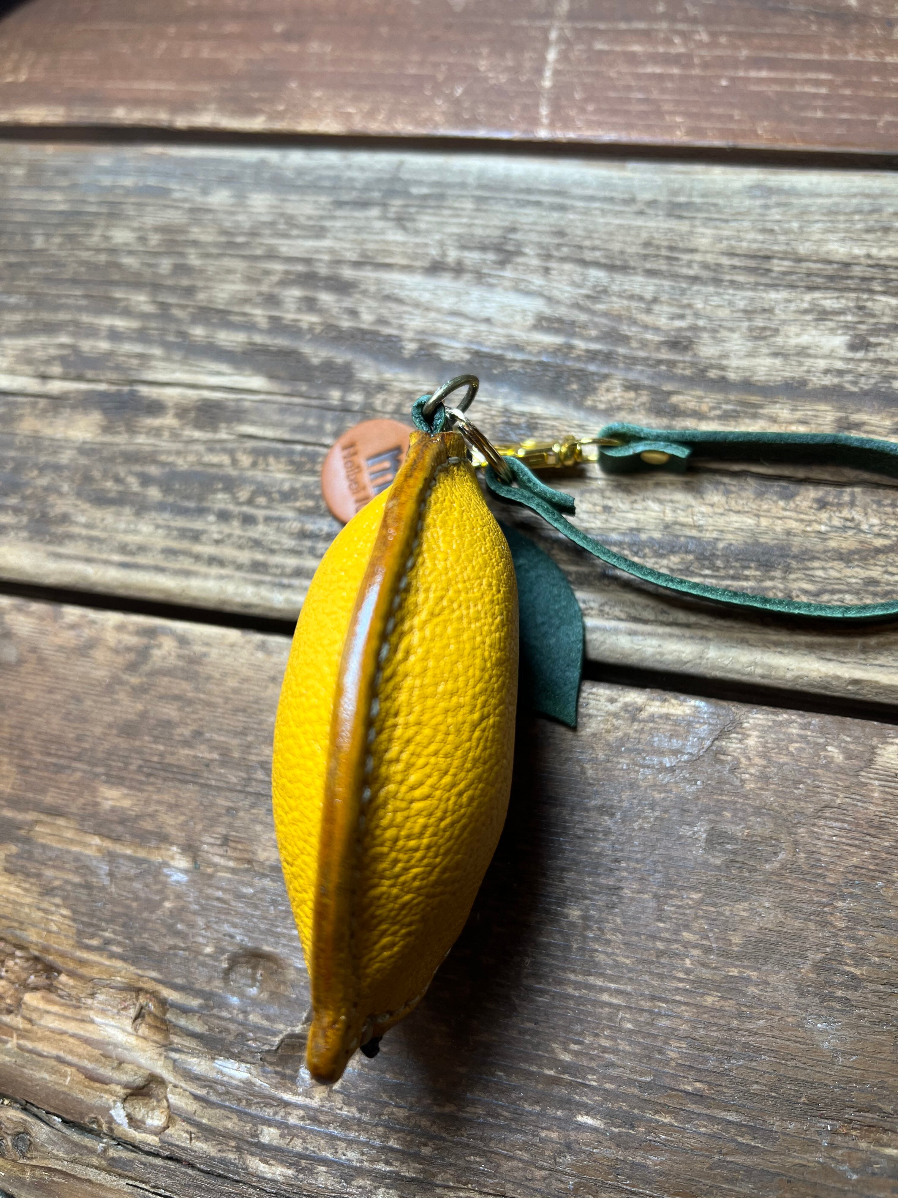 コブ牛の革を使ってレモンらしく作ってます、裏地にデニムを使ってます、サイズ縦が約9cm、横が約6cm、ファスナーが10cmYKKを使用してます