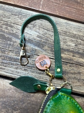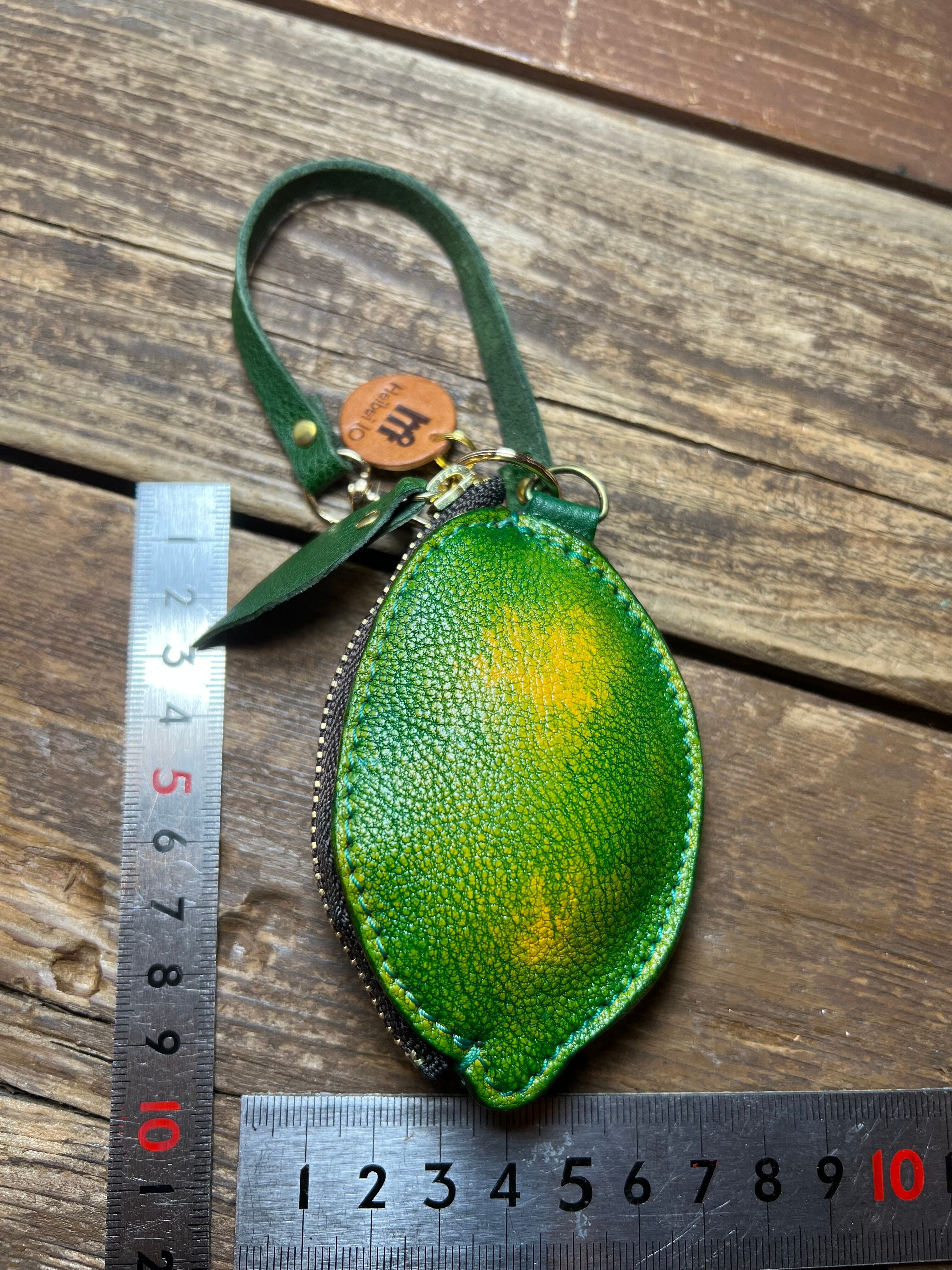 コブ牛の革黄色を緑に染色して使ってレモンらしく作ってます、裏地にデニムを使ってます、サイズ縦が約9cm、横が約6cm、ファスナーが10cmYKKを使用してます