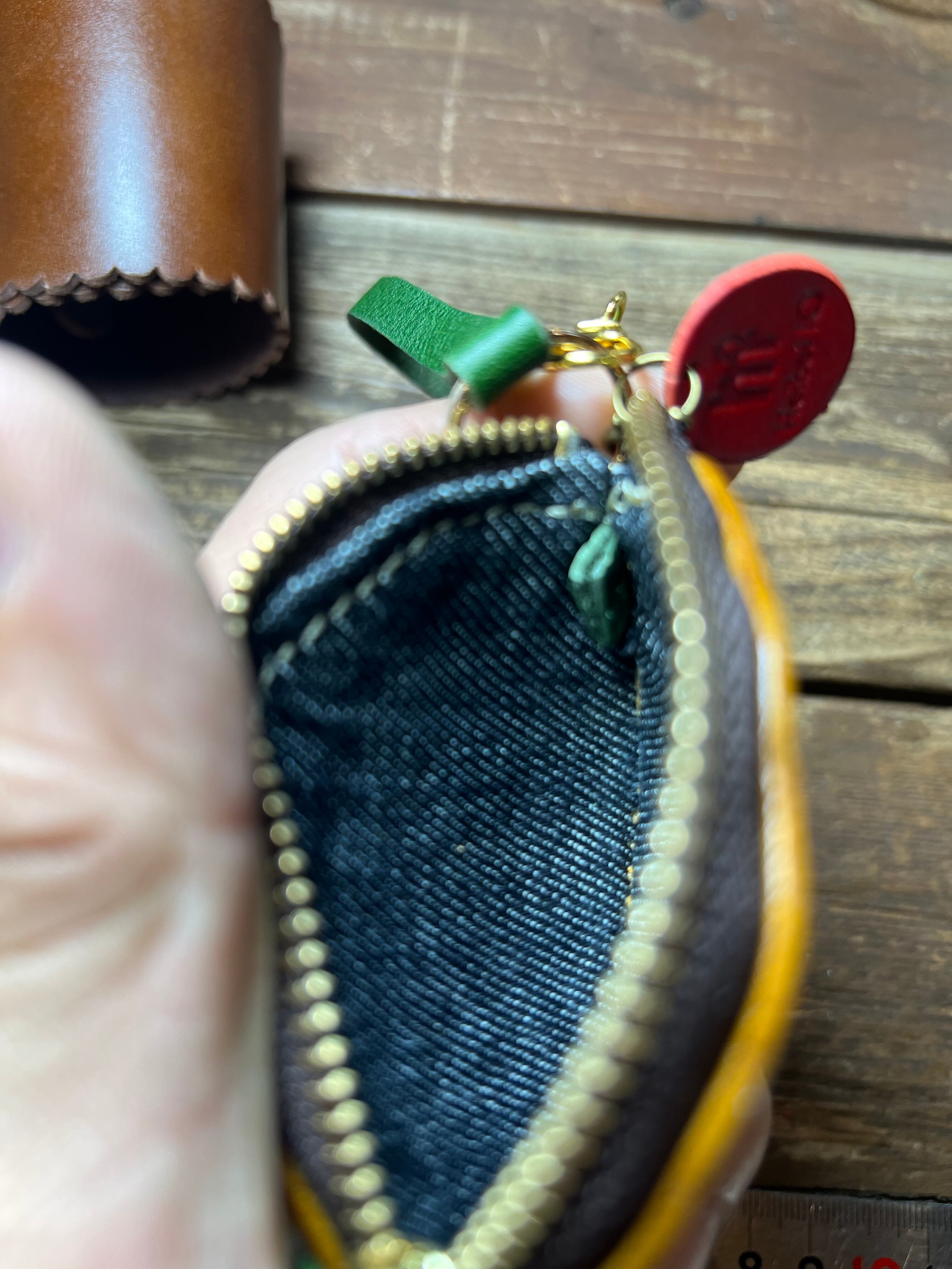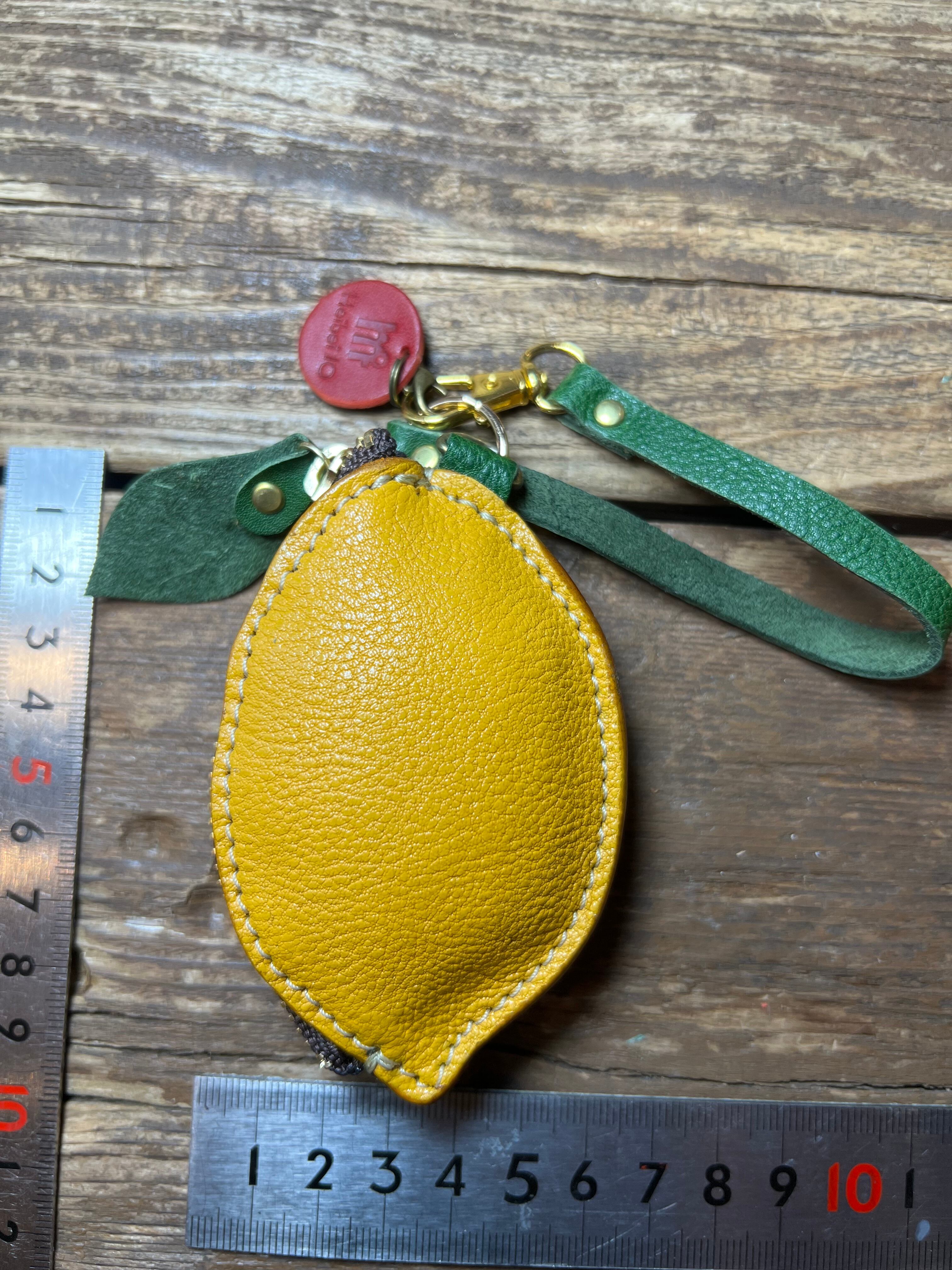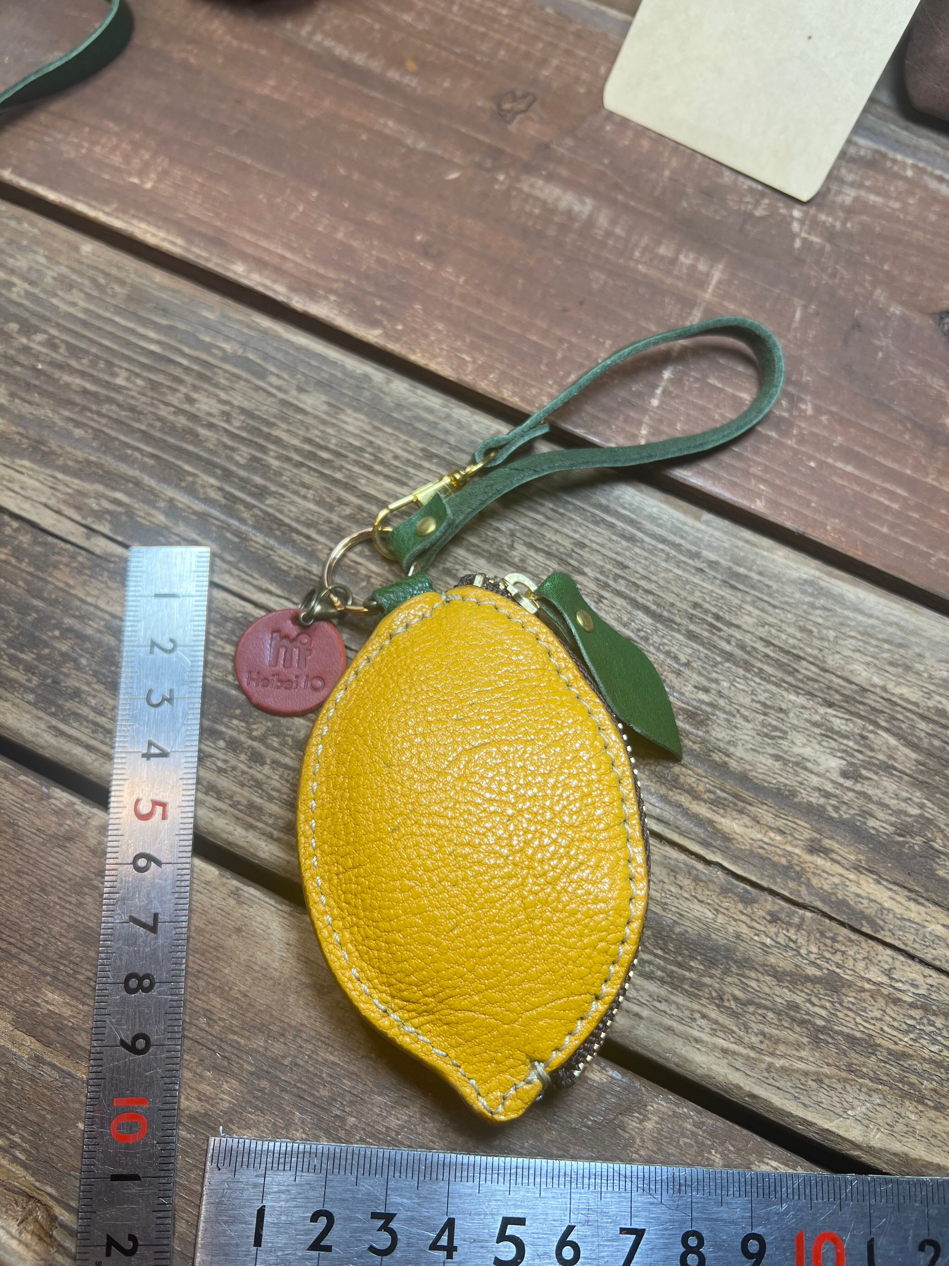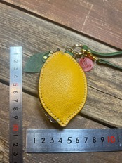 コブ牛の革を使ってレモンらしく作ってます、裏地にデニムを使ってます、サイズ縦が約9cm、横が約6cm、ファスナーが10cmYKKを使用してます