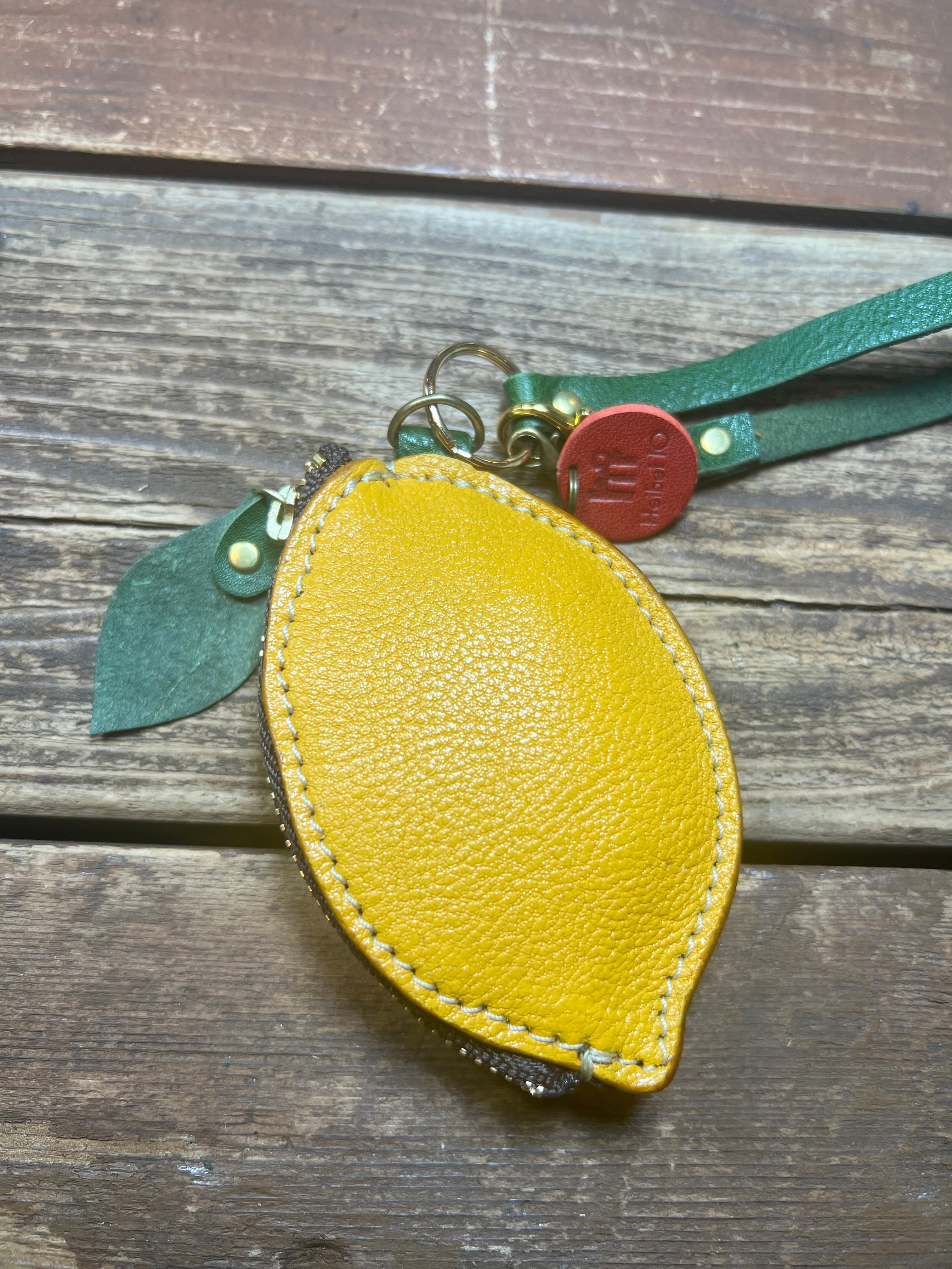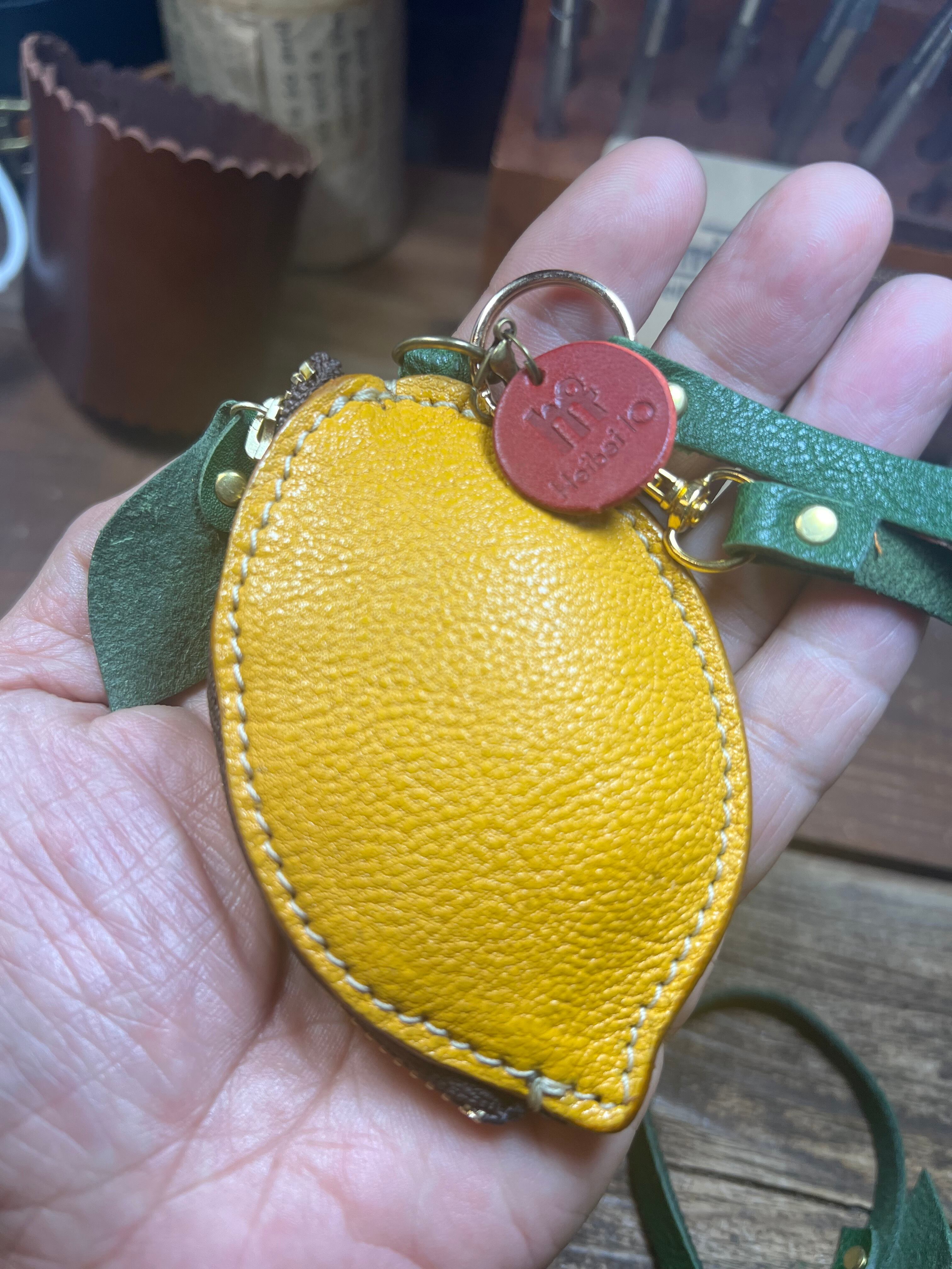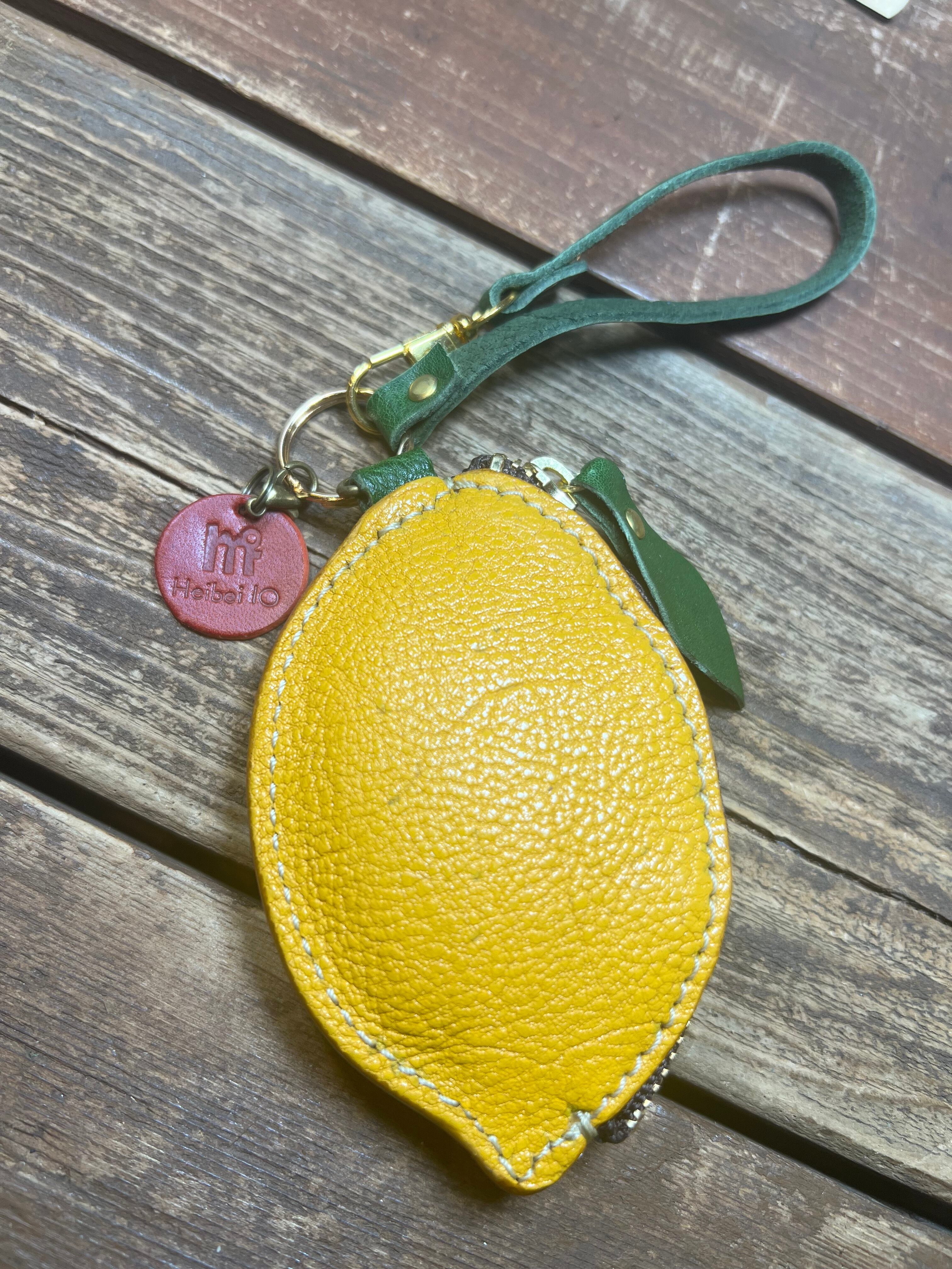 コブ牛の革を使ってレモンらしく作ってます、裏地にデニムを使ってます、サイズ縦が約9cm、横が約6cm、ファスナーが10cmYKKを使用してます
