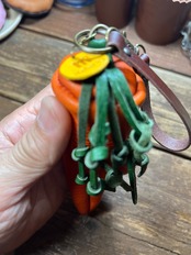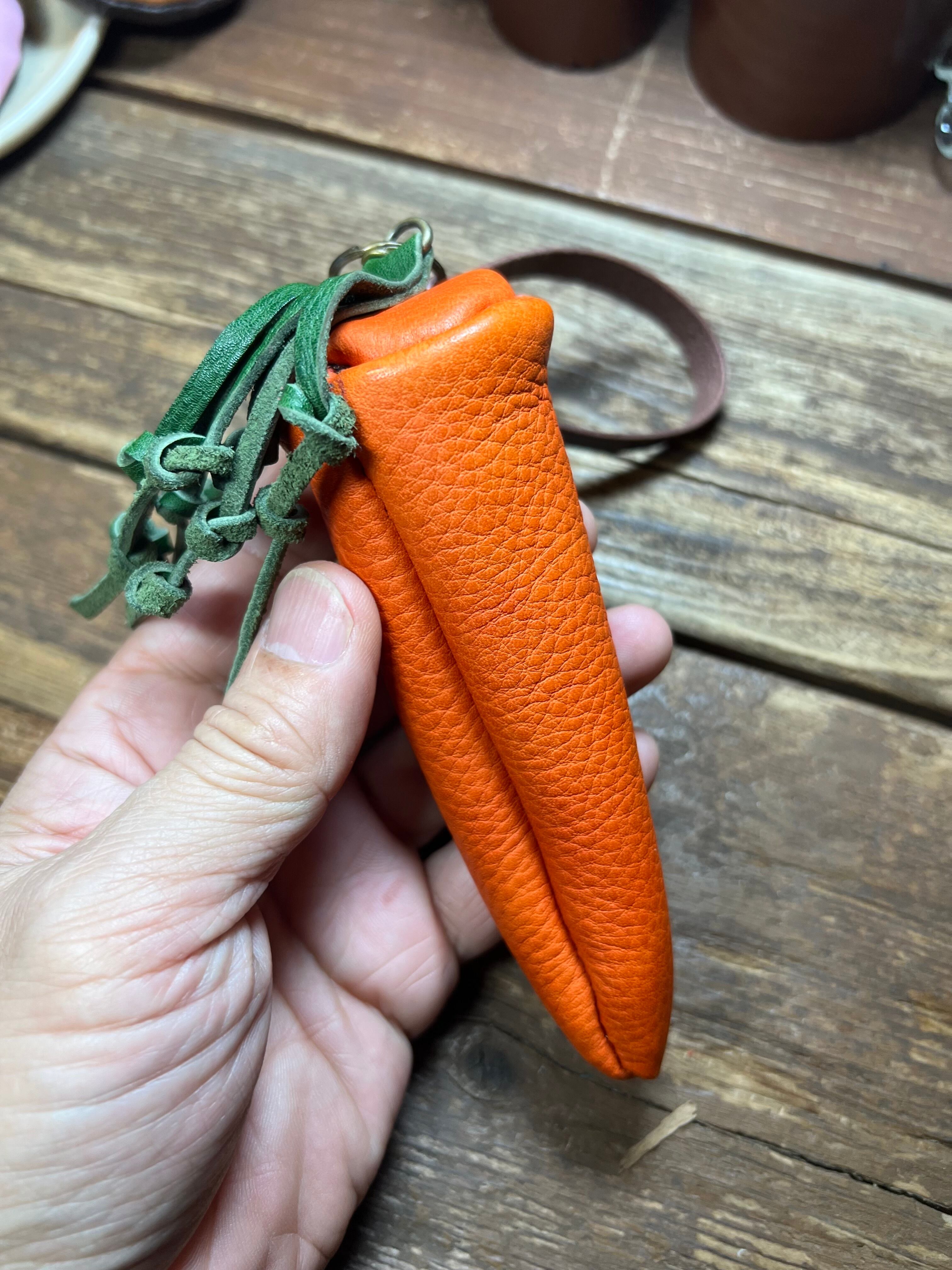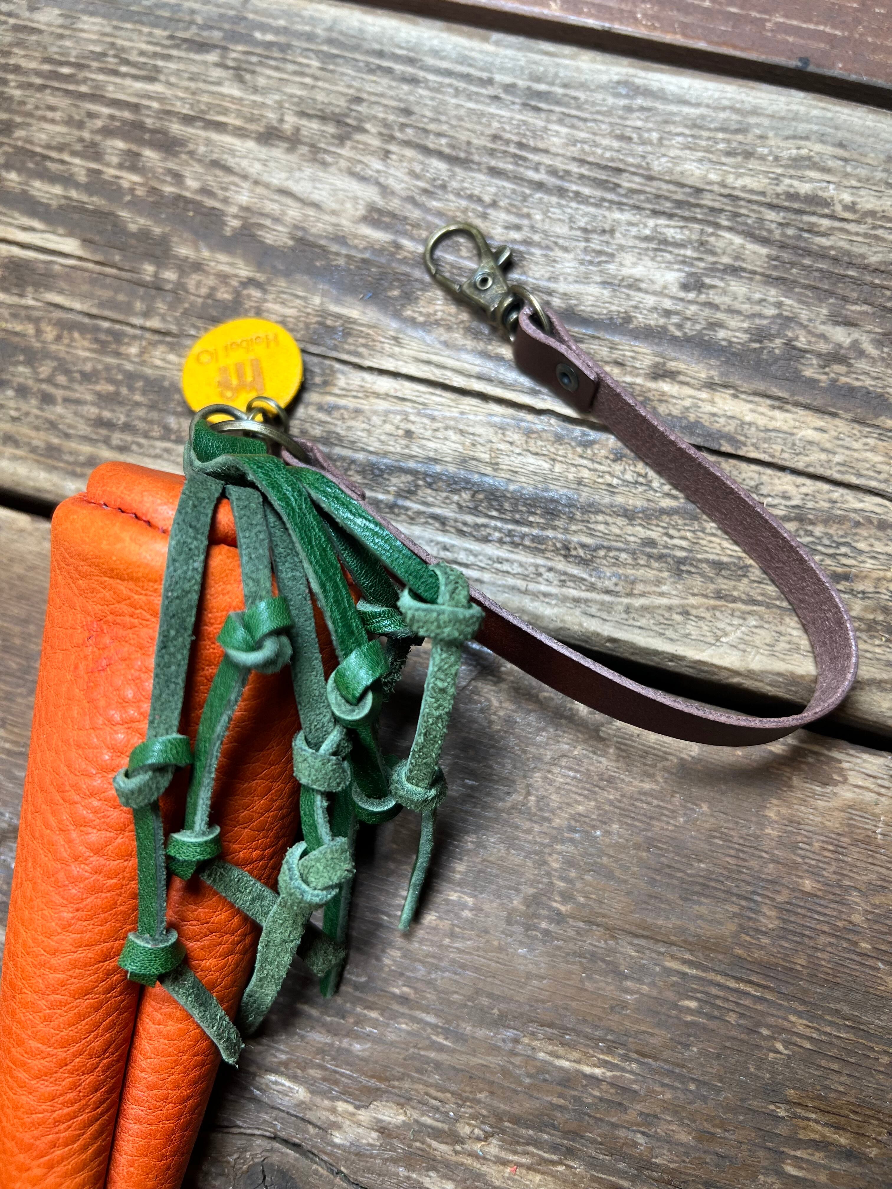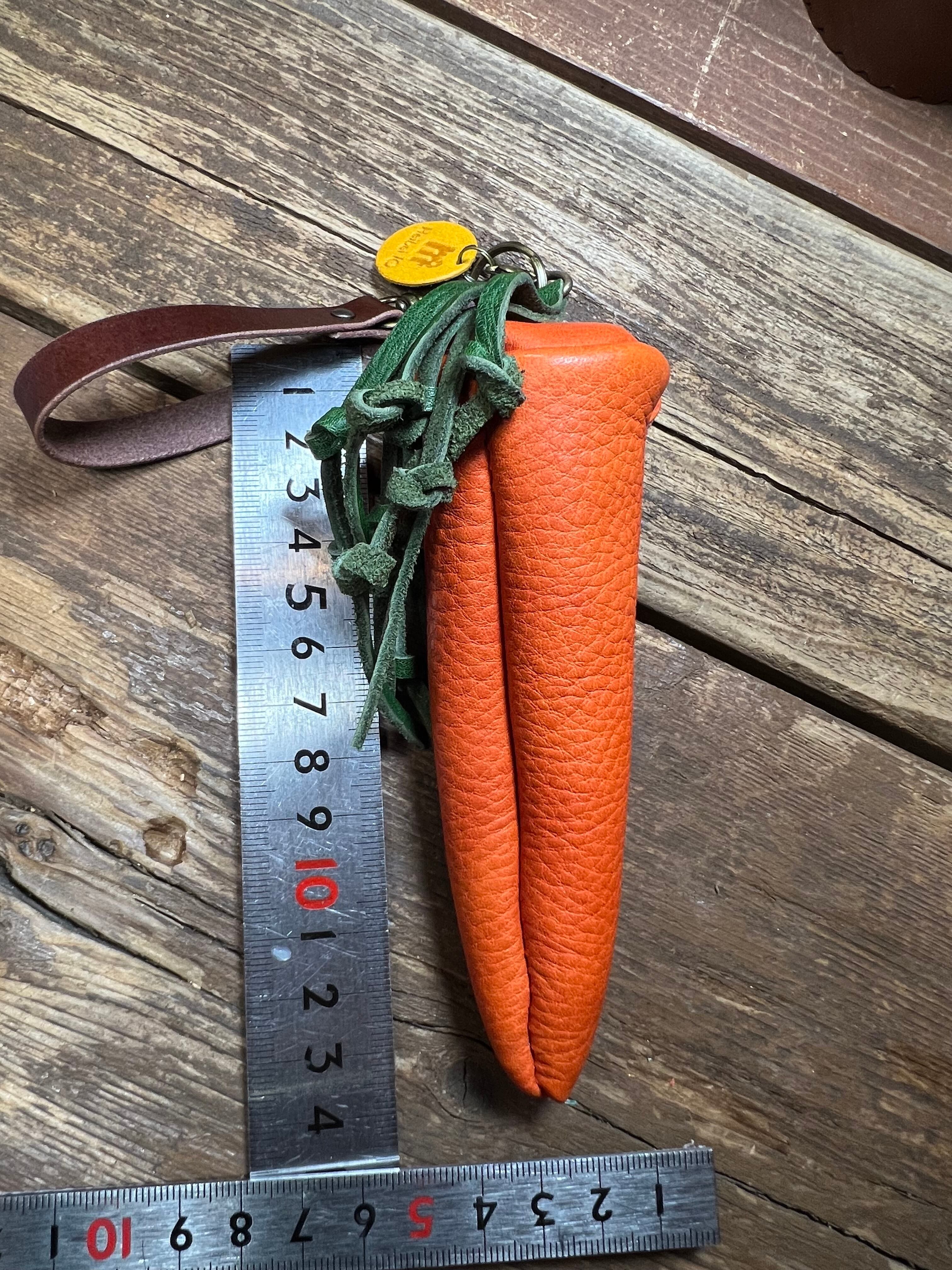オレンジ色の柔らかい牛シュリンクレザーで作っています。サイズが縦横約13cmマチが5cm〜3cmです。写真が原物です。ファスナーはYKK10cmです