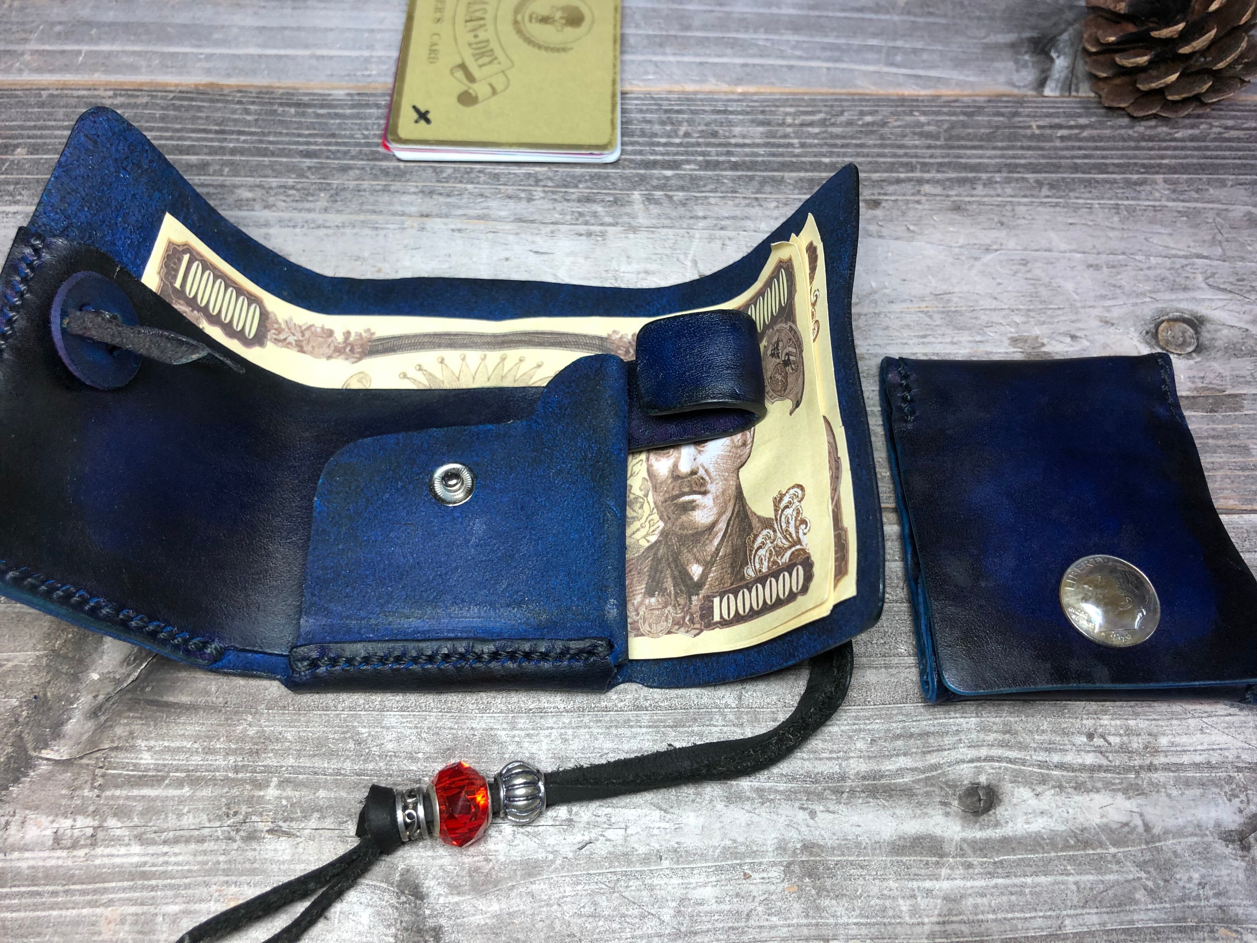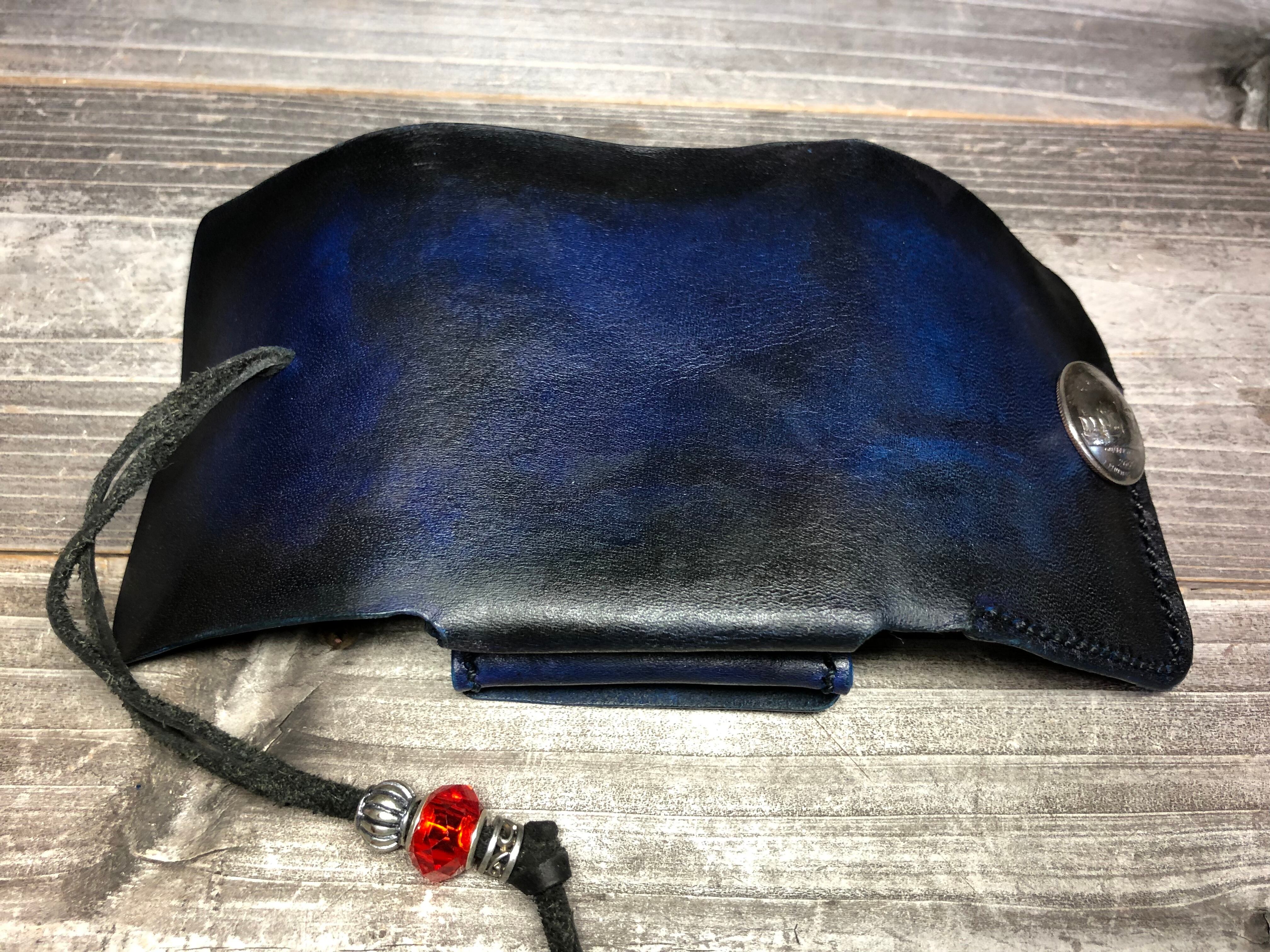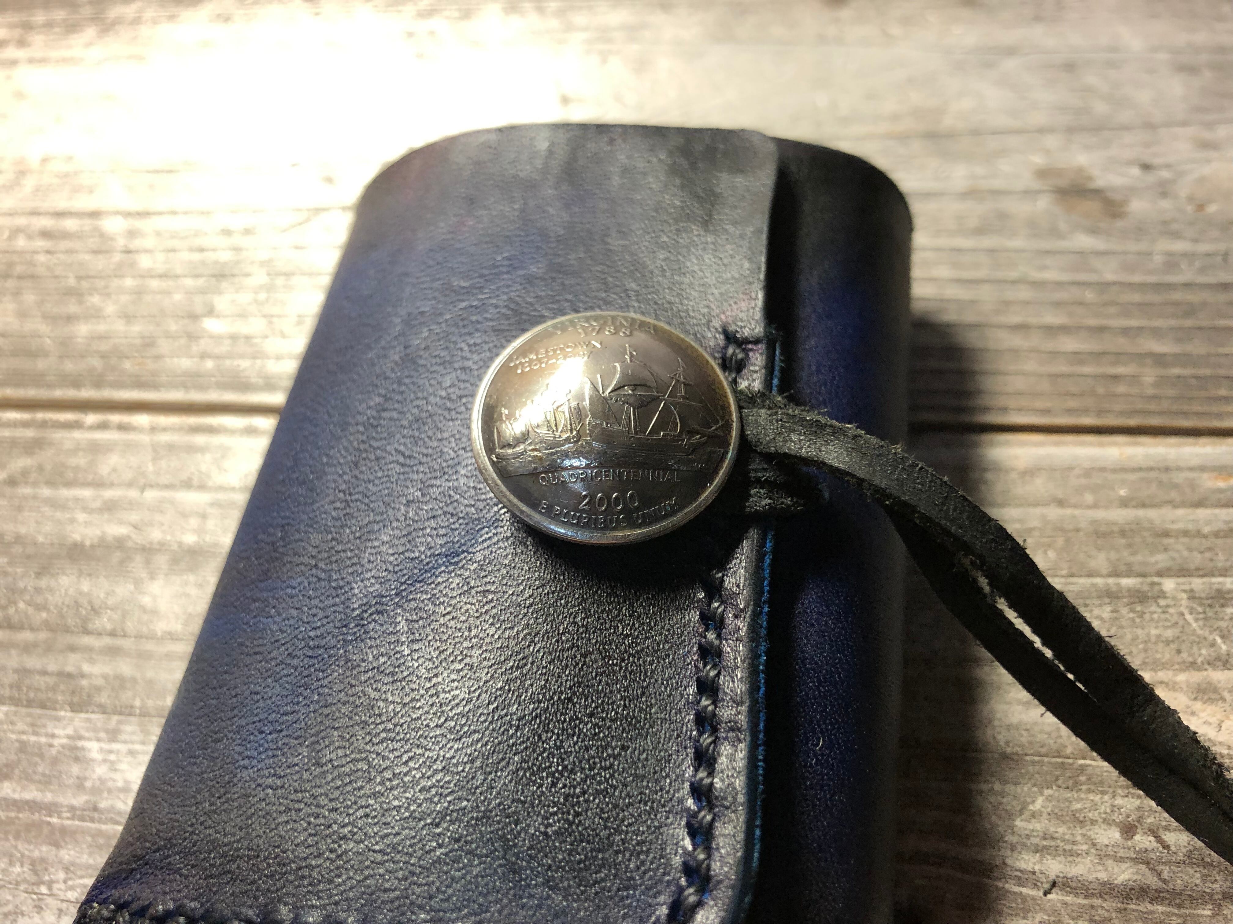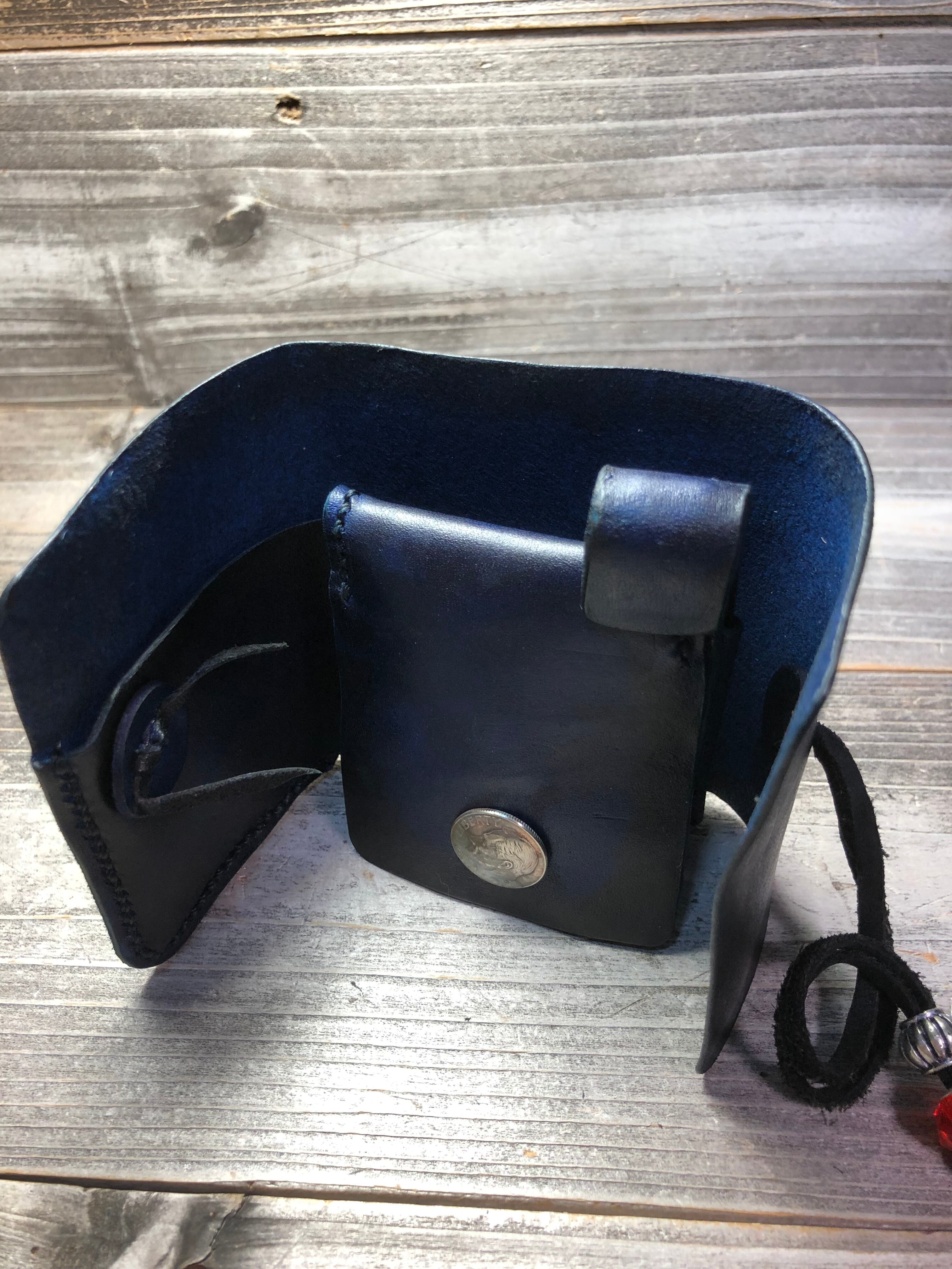 革はツーリングレザー1、2ミリを染料しています横オープン時約19cm、収納時約7cm、縦約9cmです