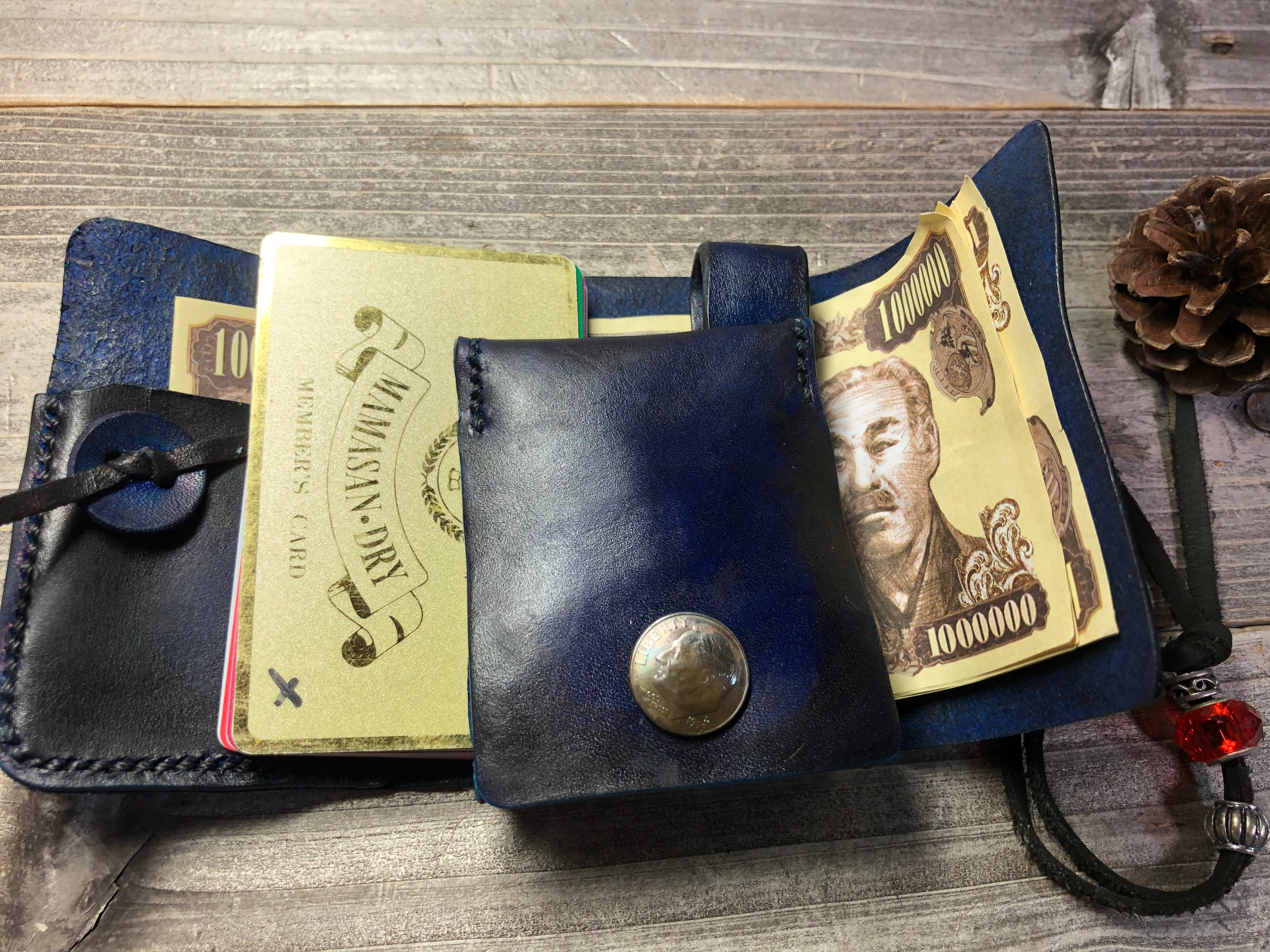 財布の厚さを気にせず革ひもで調整して収納できます。利点は革ひもを色々交換できます
