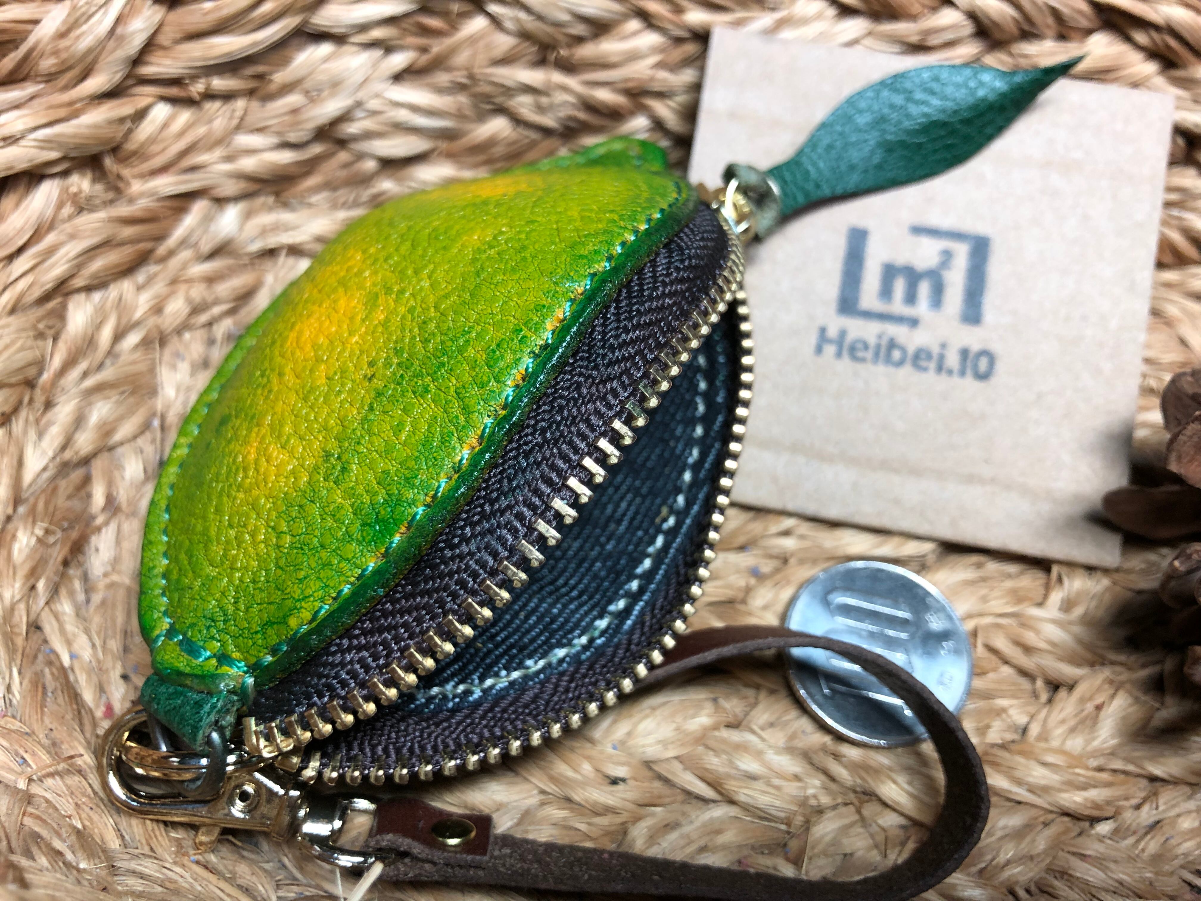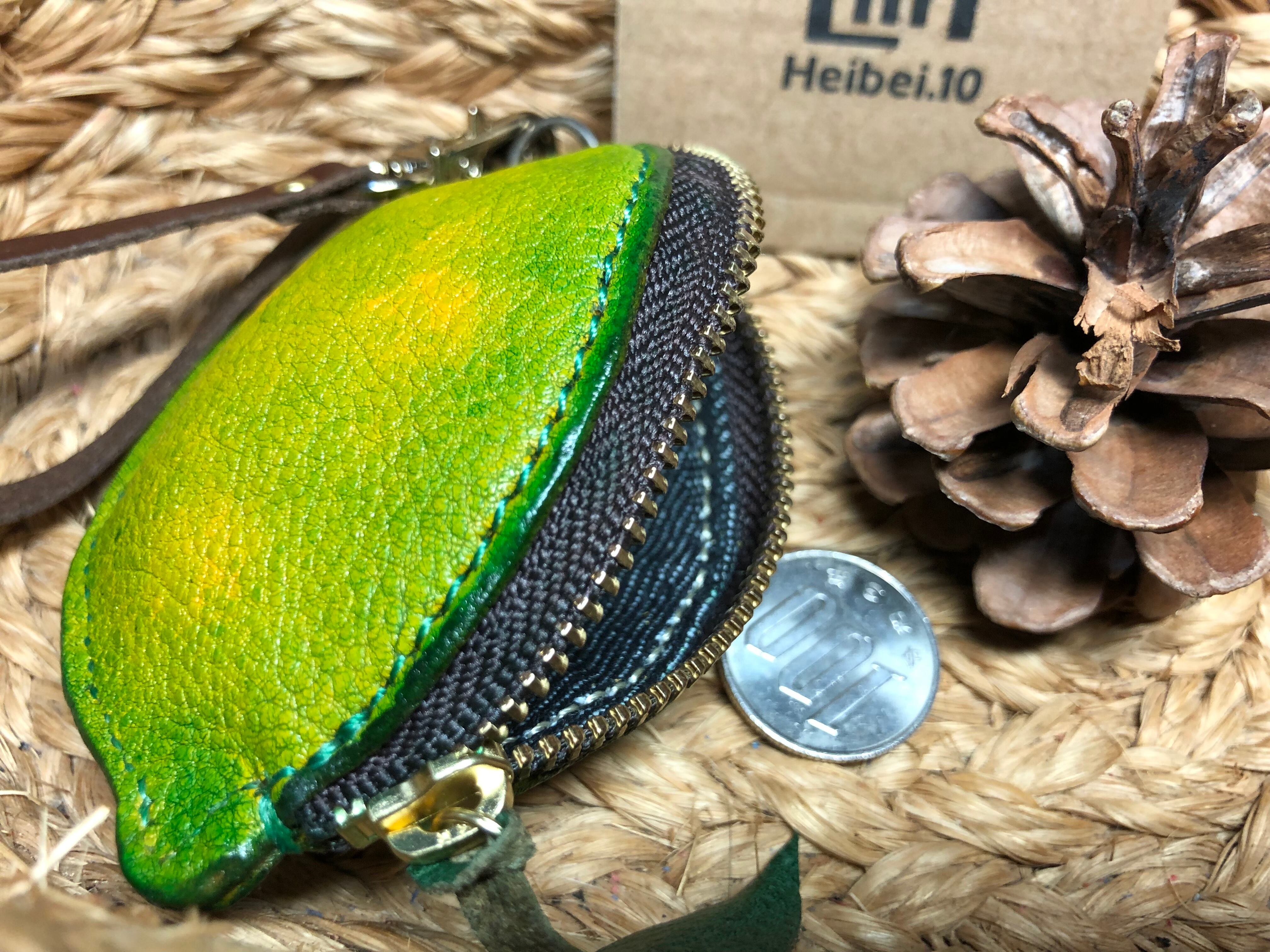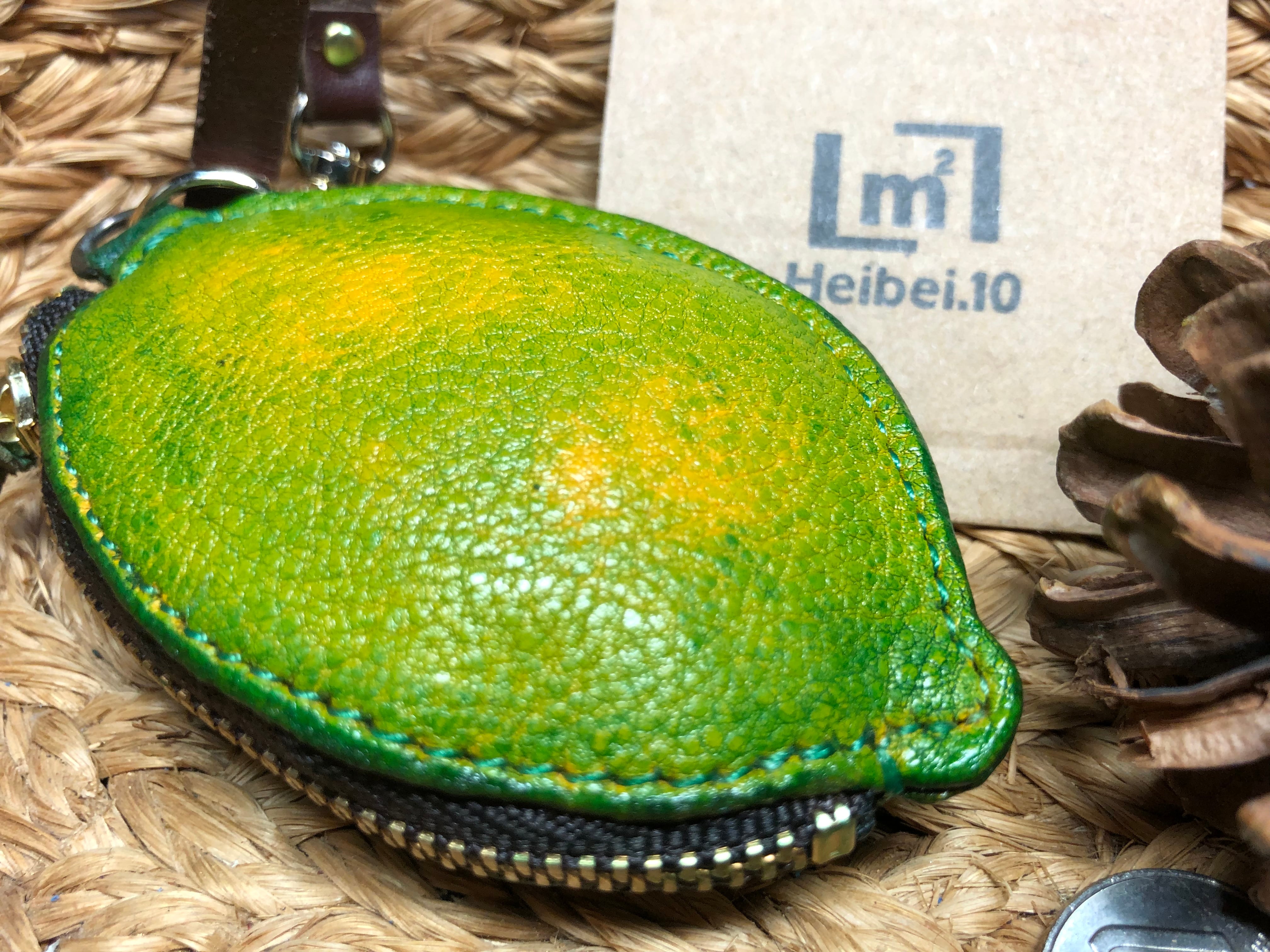 コブ牛の革を緑に染色して使ってレモンらしく作ってます、裏地にデニムを使ってます、サイズ縦が約9cm、横が約6cm、ファスナーが10cmYKKを使用してます