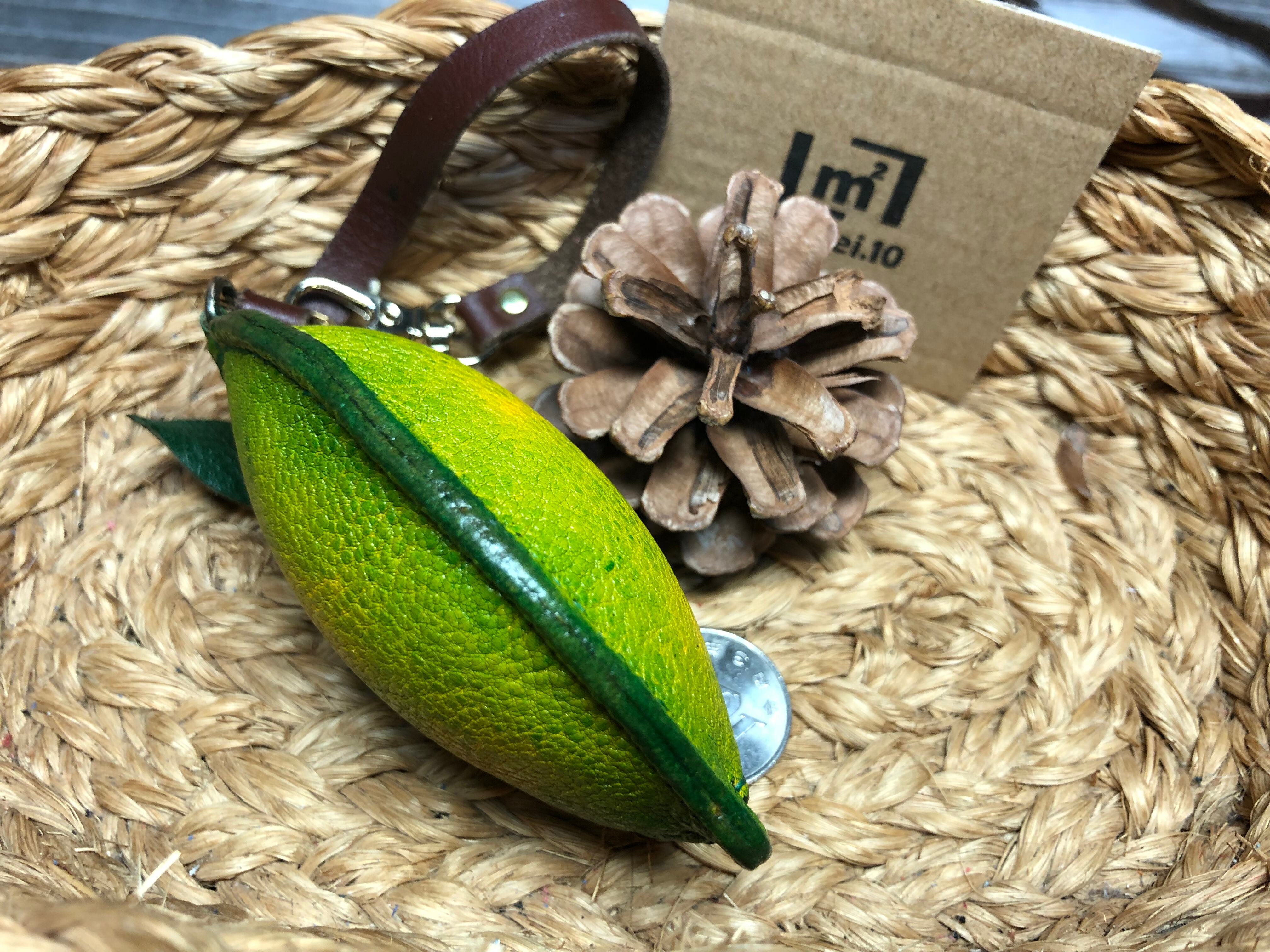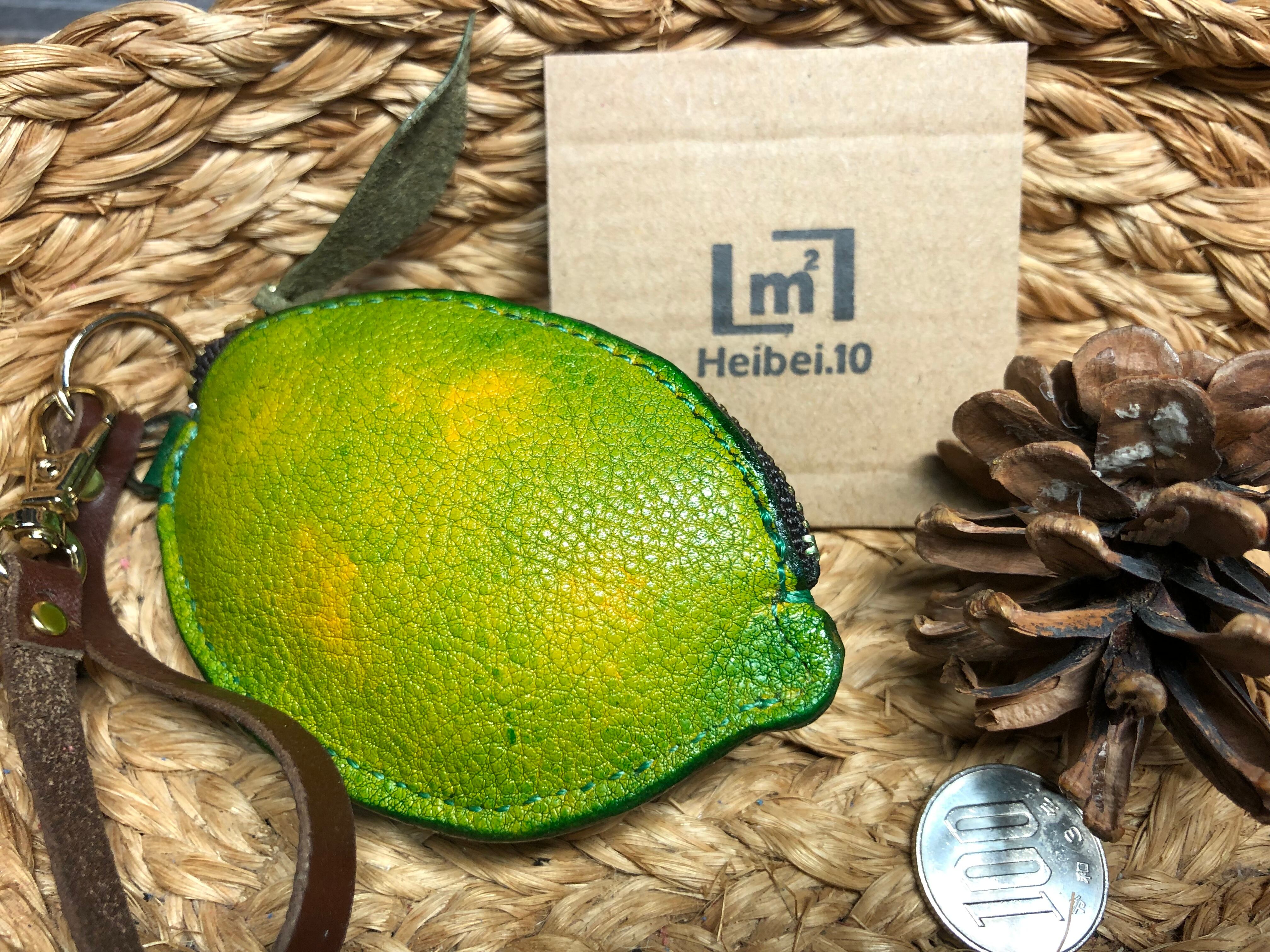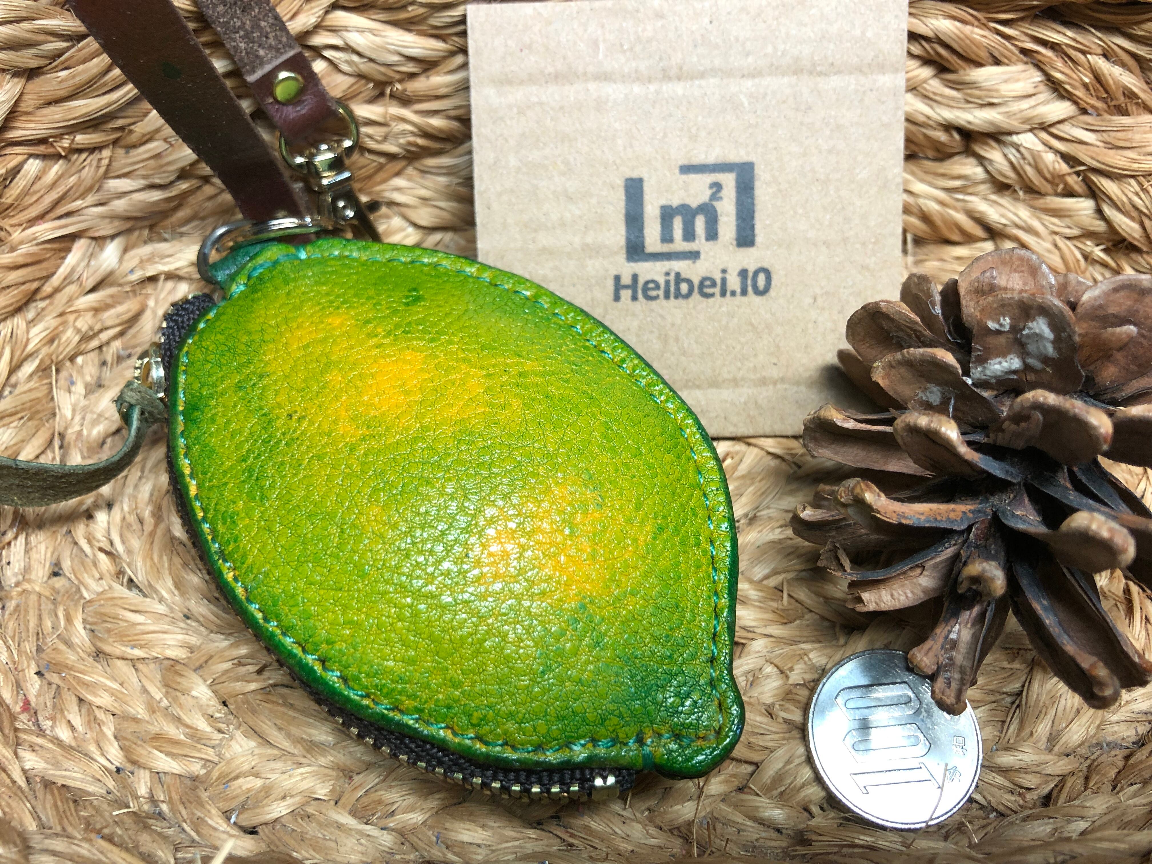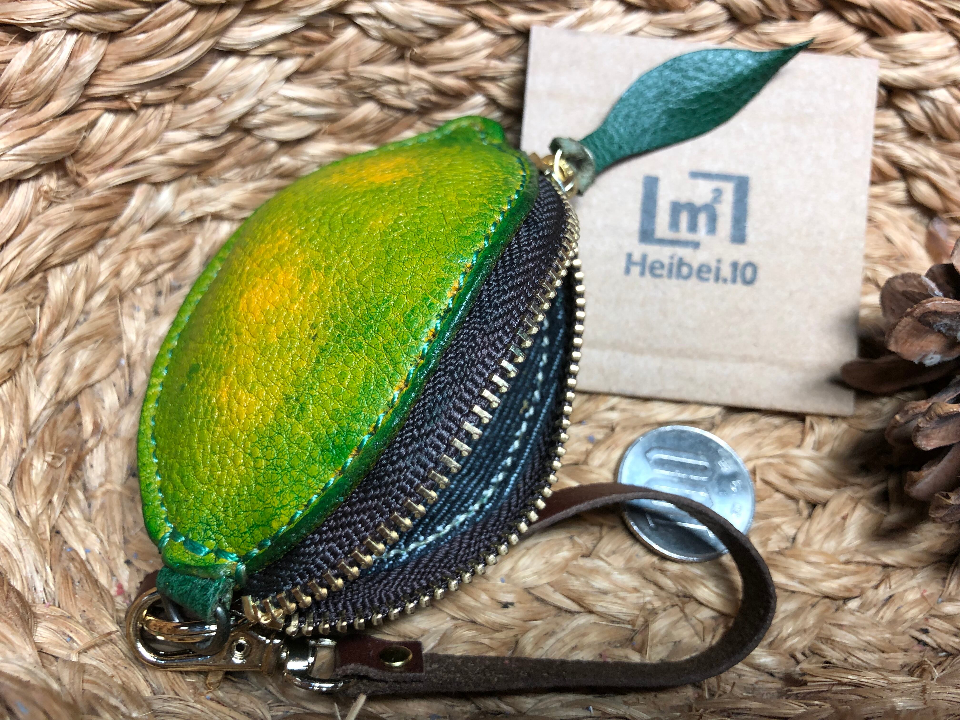 コブ牛の革を緑に染色して使ってレモンらしく作ってます、裏地にデニムを使ってます、サイズ縦が約9cm、横が約6cm、ファスナーが10cmYKKを使用してます