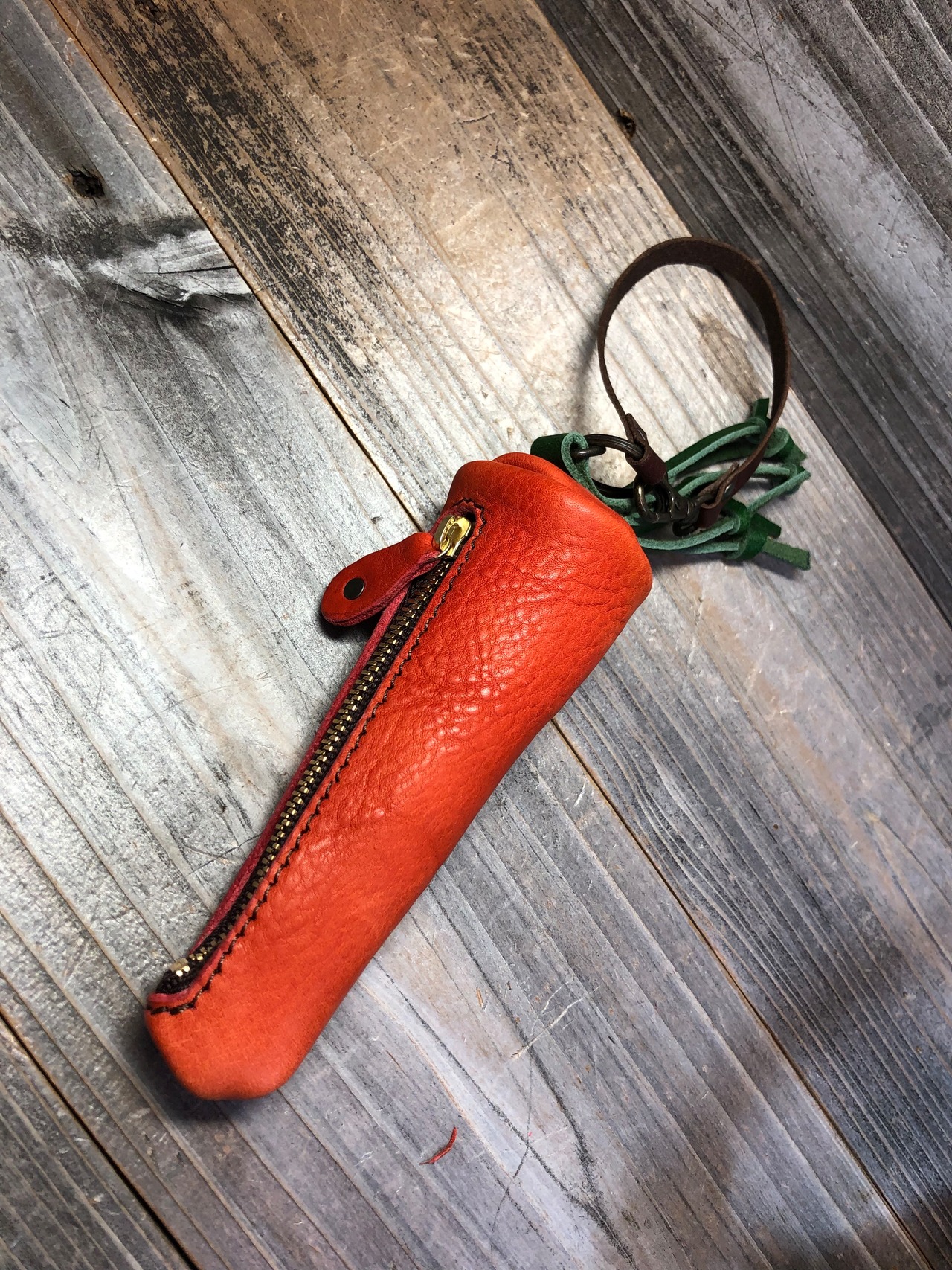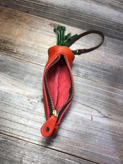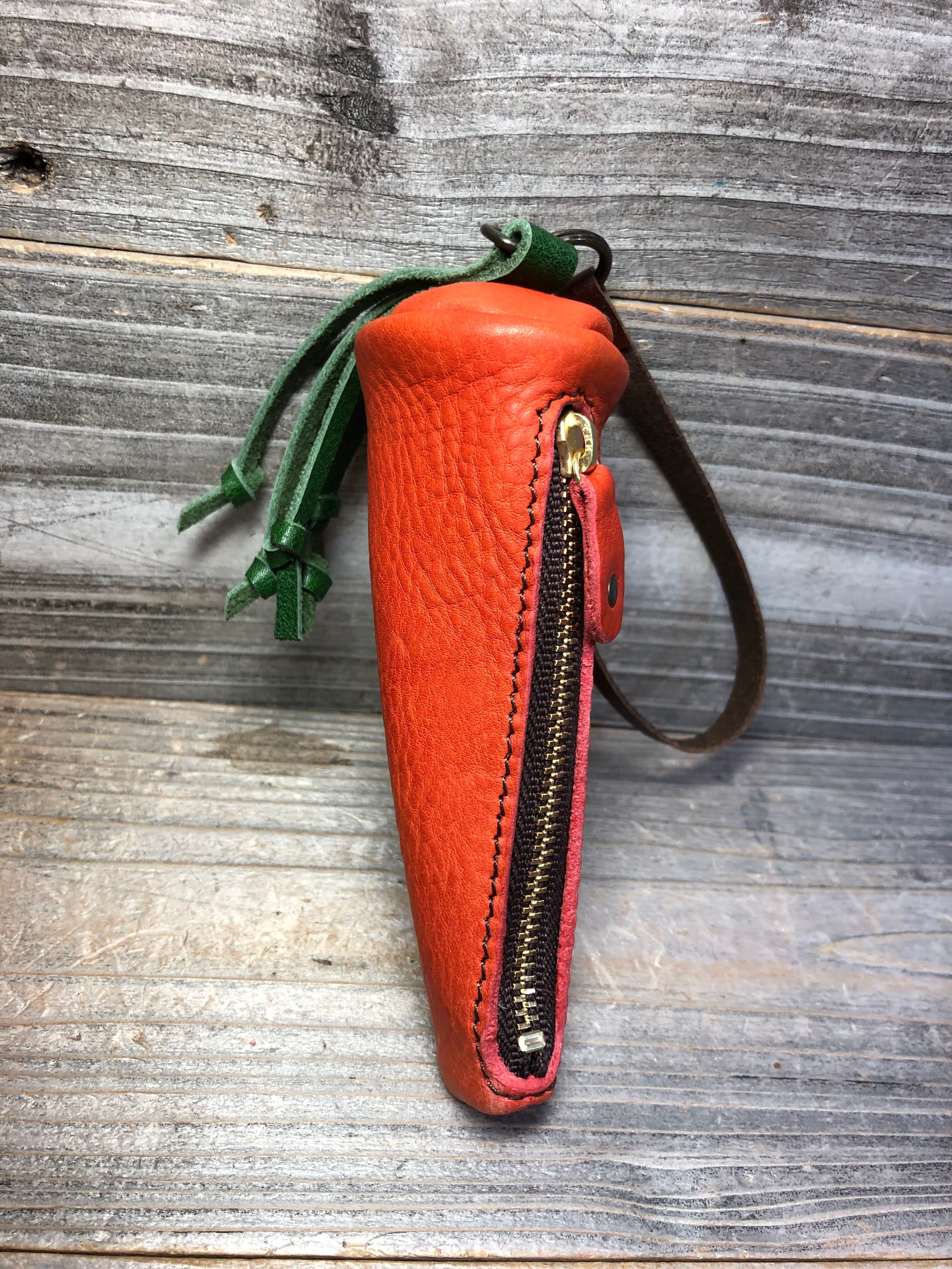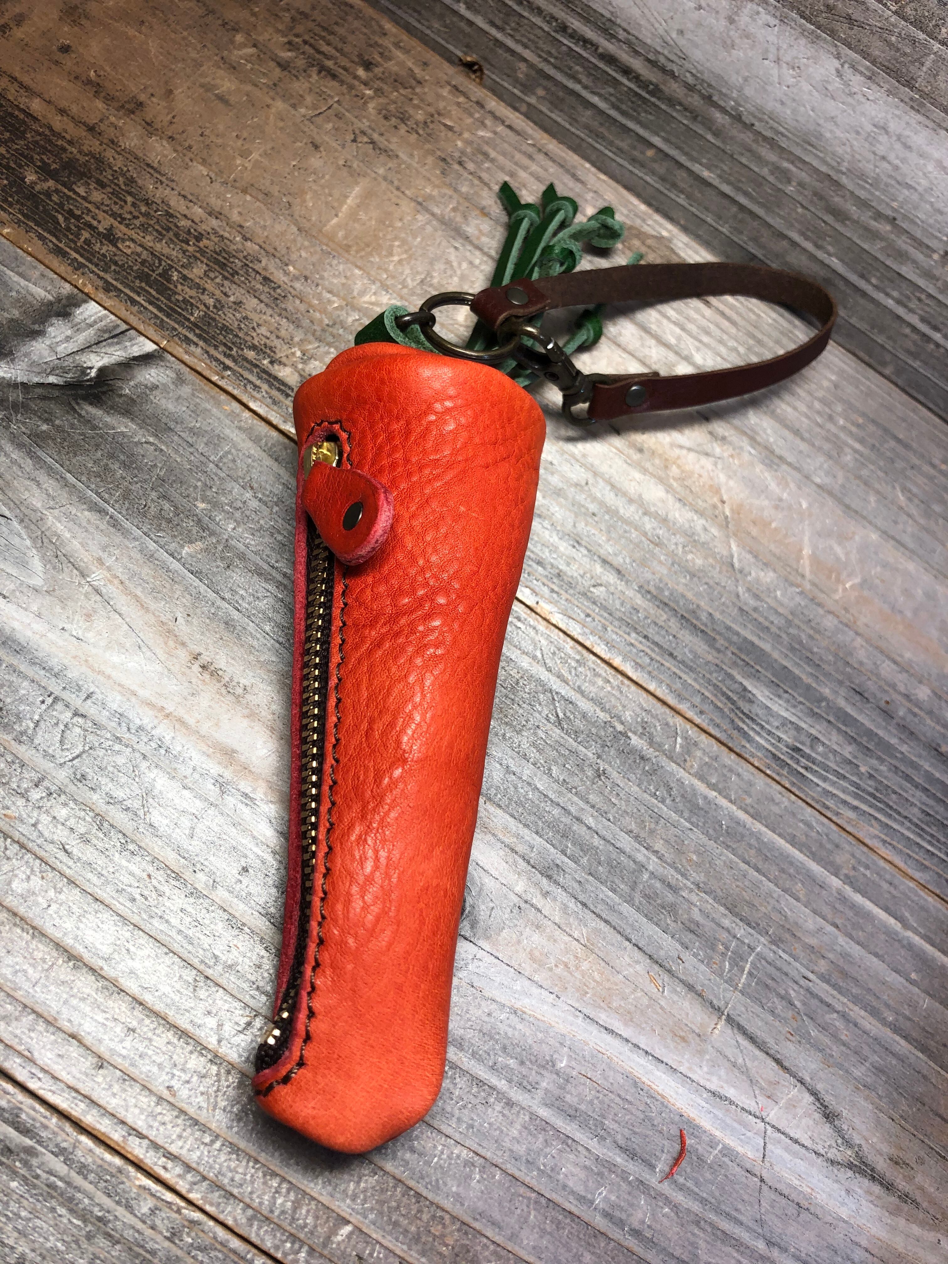 オレンジ色の柔らかい牛シュリンクレザーで作っています。サイズが縦横約13cmマチが5cm〜3cmです。写真が原物です。革なのでシワ(シボ)にも個性がありますのでよろしくお願い致します。コインはこれ以上入りそうです参考までに。