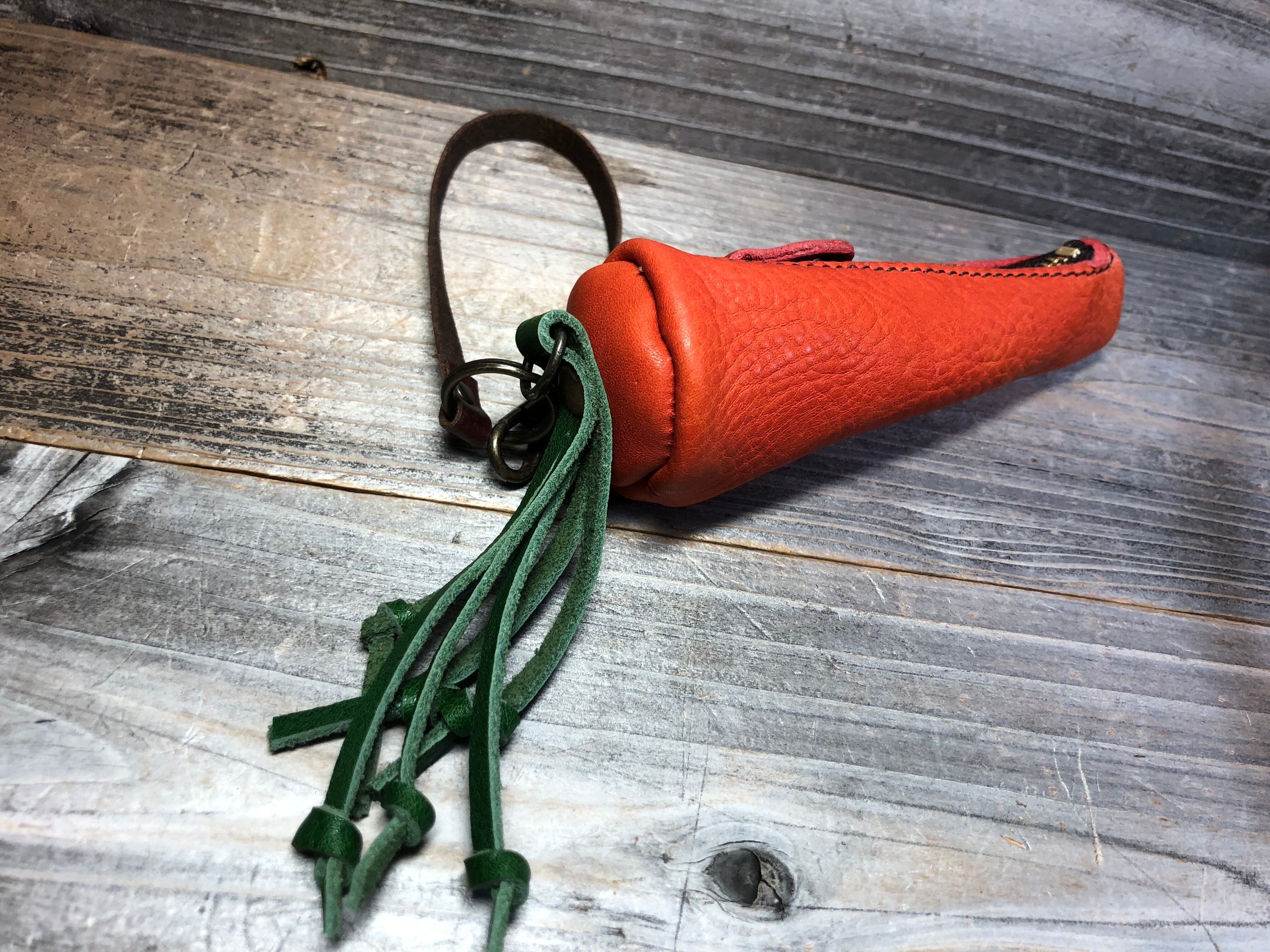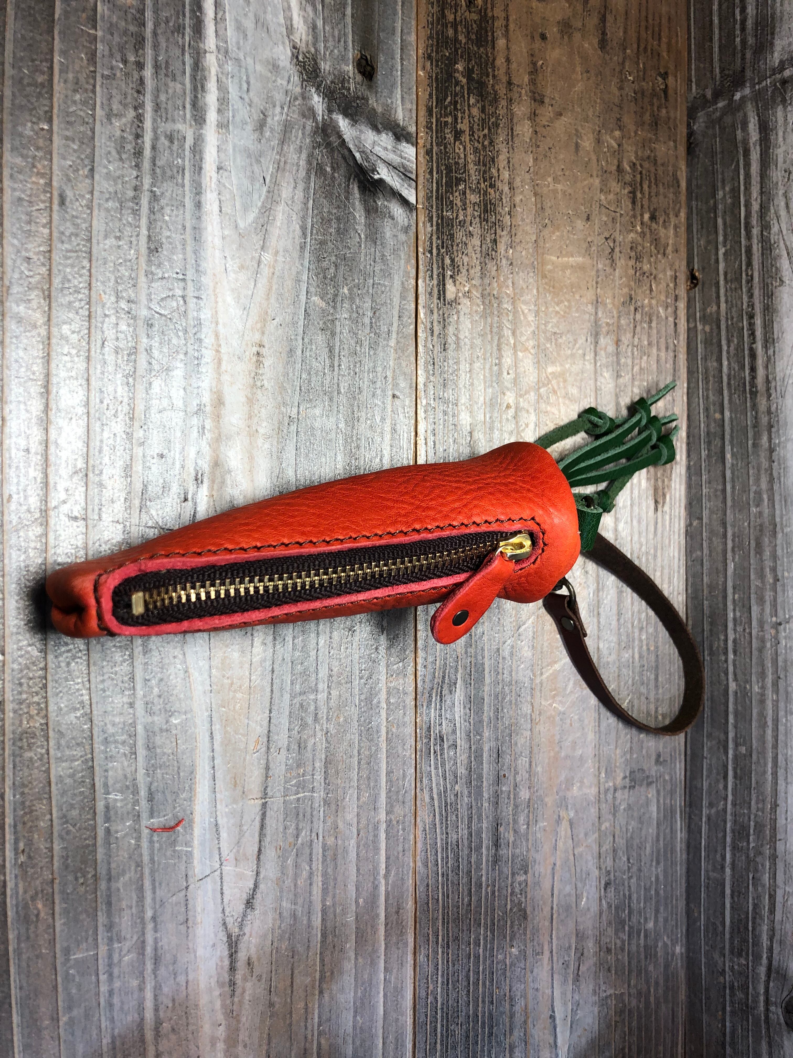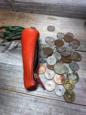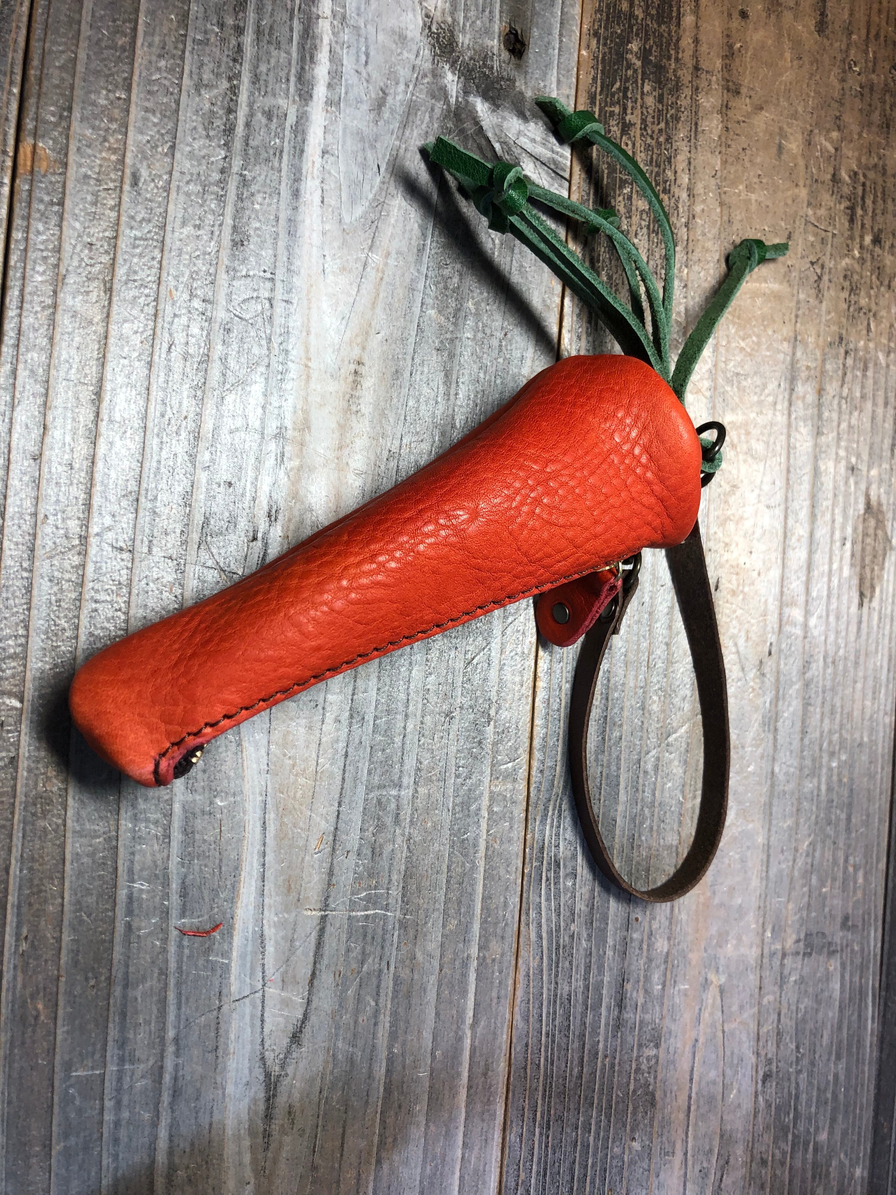 オレンジ色の柔らかい牛シュリンクレザーで作っています。サイズが縦横約13cmマチが5cm〜3cmです。写真が原物です。革なのでシワ(シボ)にも個性がありますのでよろしくお願い致します。コインはこれ以上入りそうです参考までに。