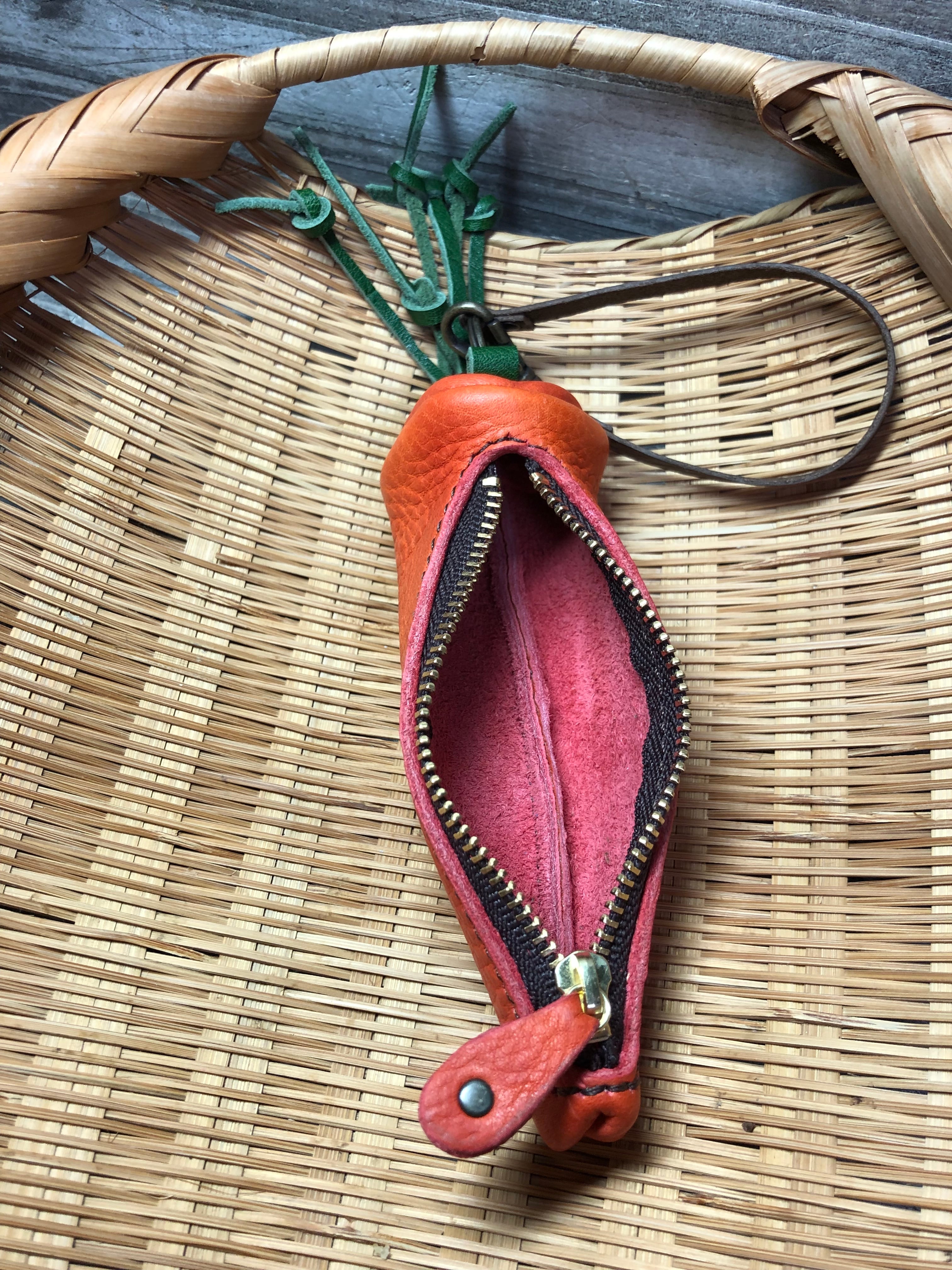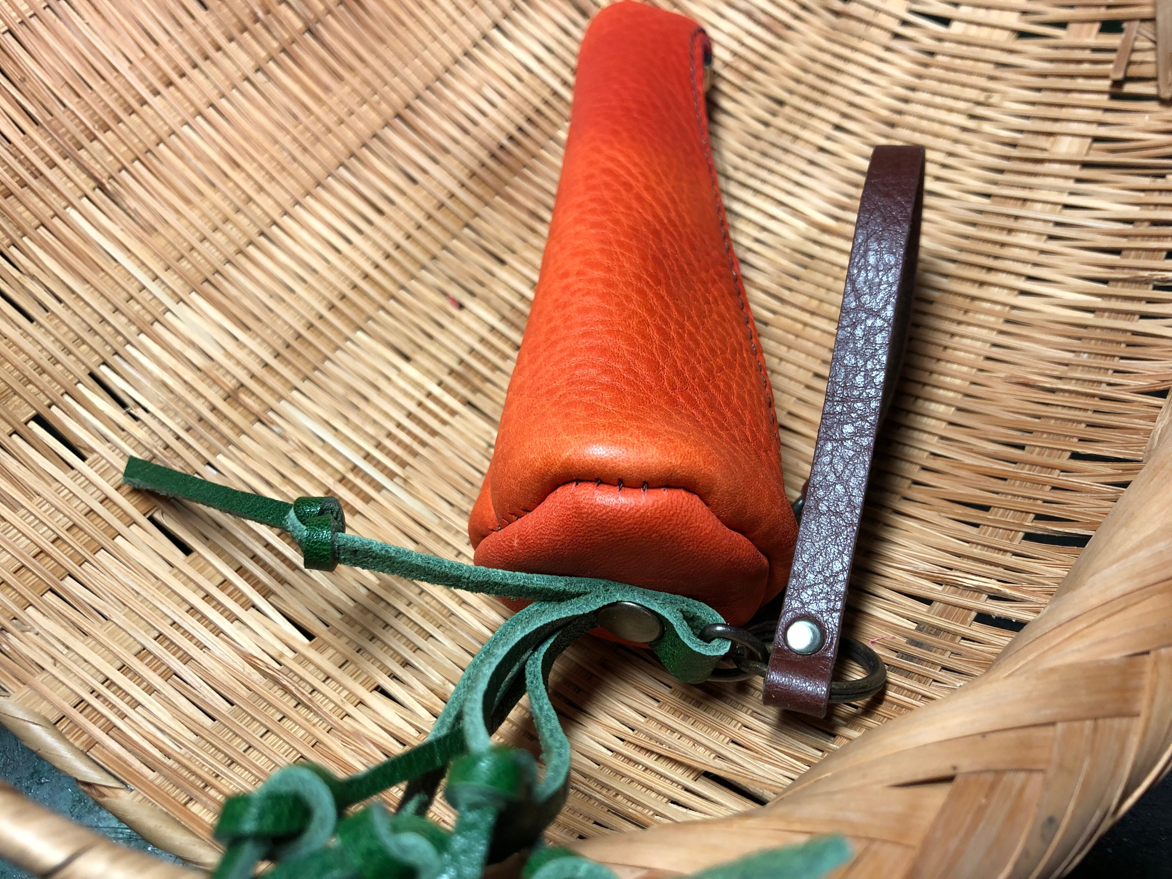 オレンジ色の柔らかい牛シュリンクレザーで作っています。サイズが縦横約13cmマチが5cm〜3cmです。写真が原物です。革なのでシワ(シボ)にも個性がありますのでよろしくお願い致します。コインはこれ以上入りそうです参考までに。