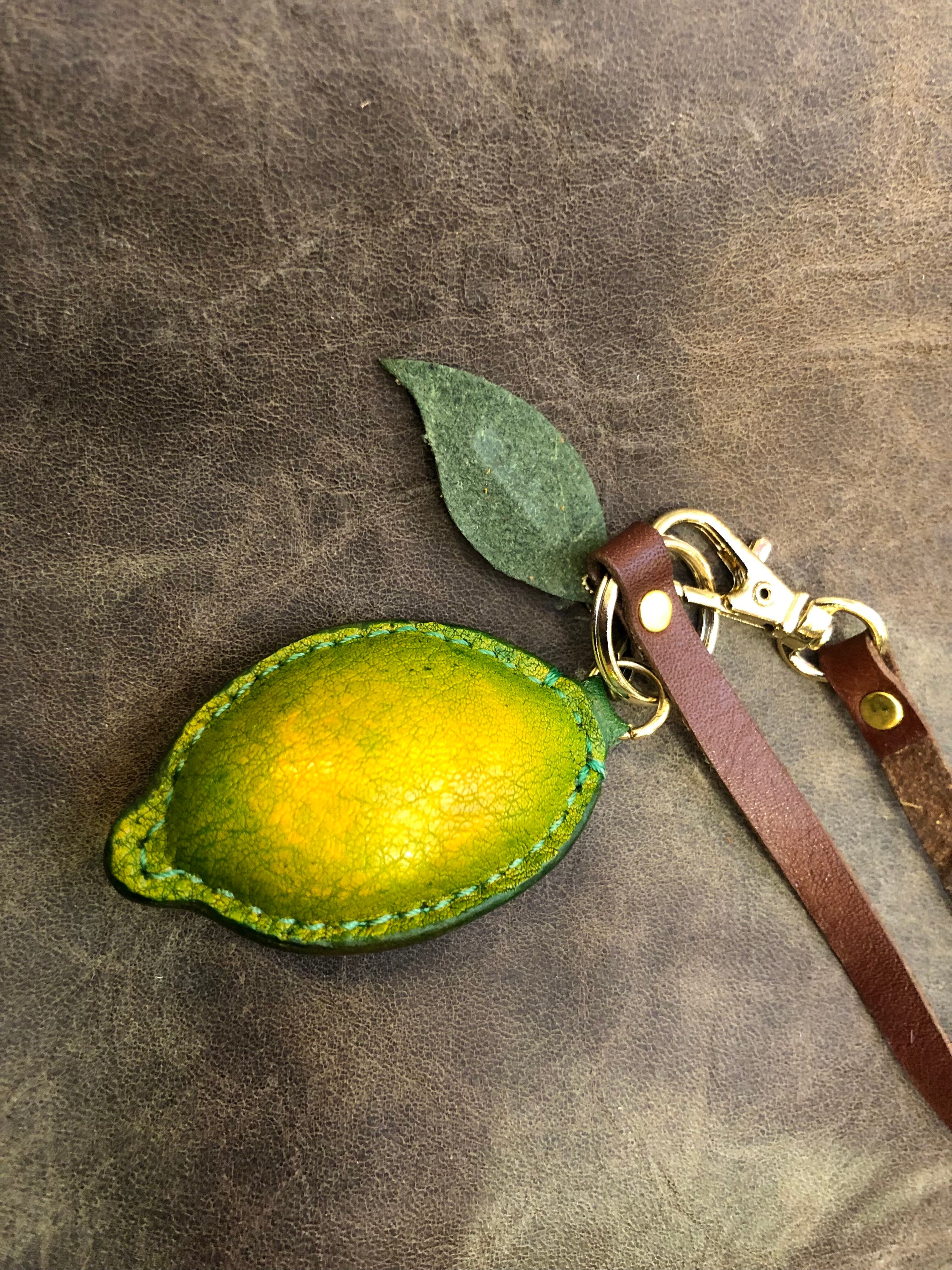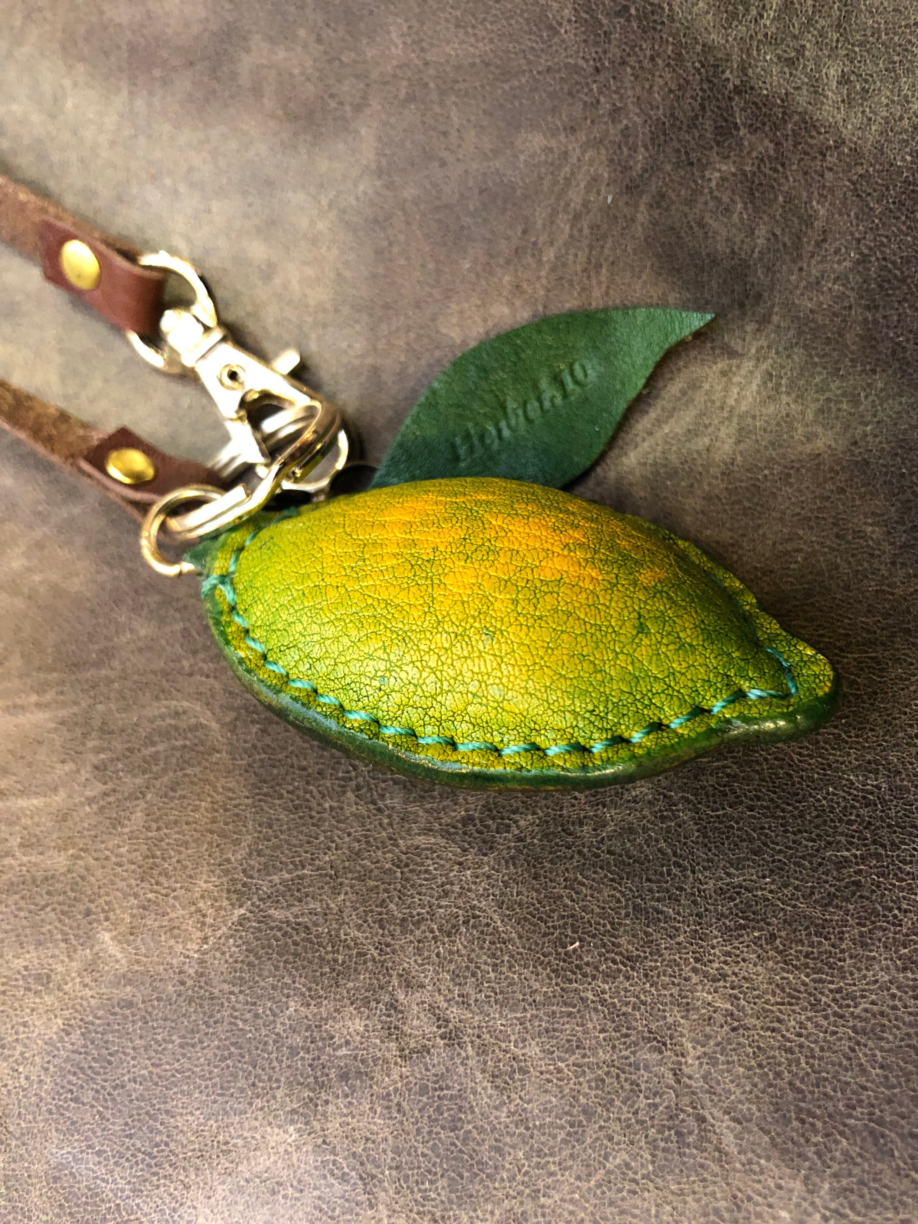 黄色のコブ牛の革を緑色を加えて染料して使って若いレモンらしく、ふっくらと可愛らしく仕上げてます。
