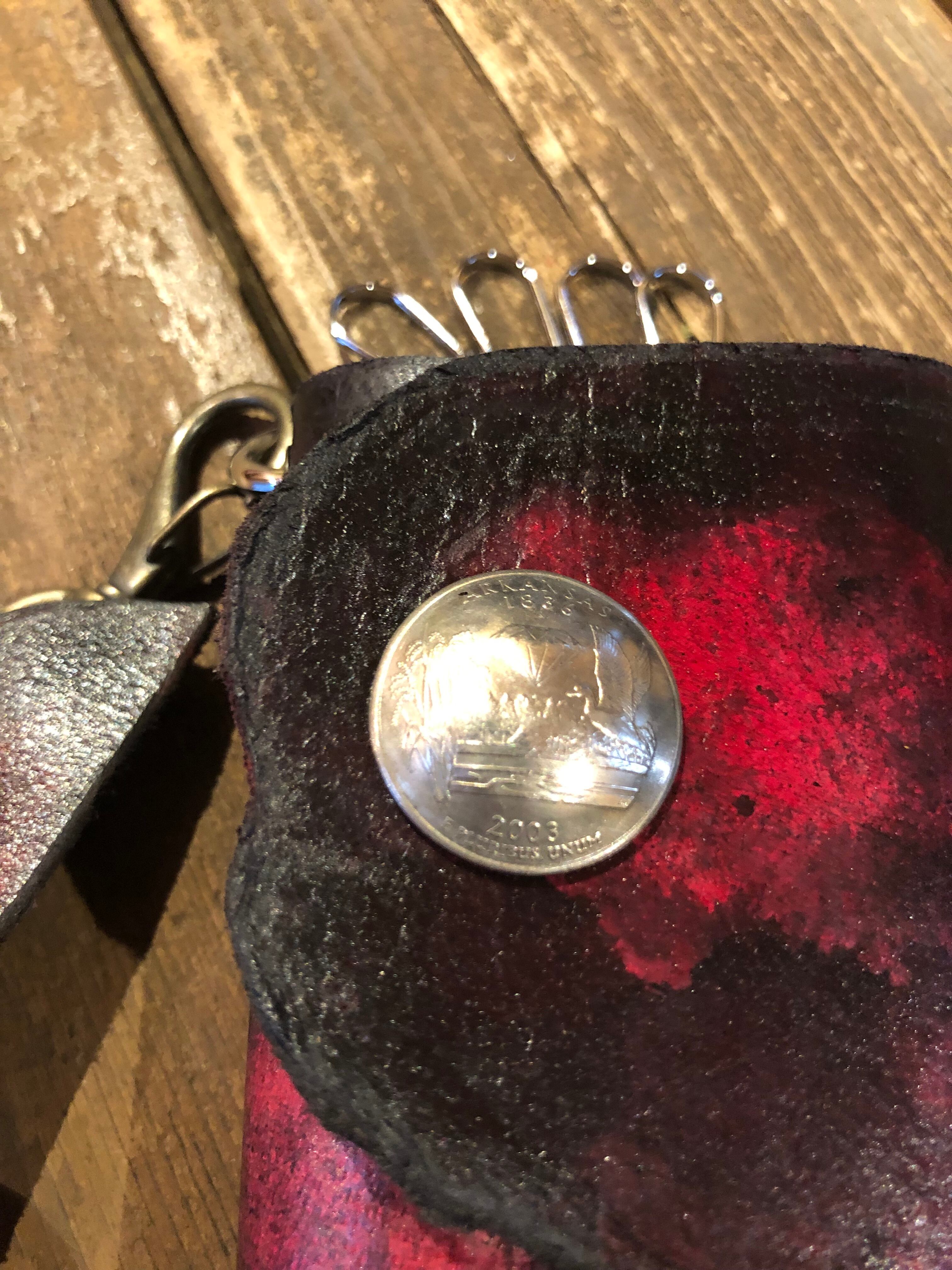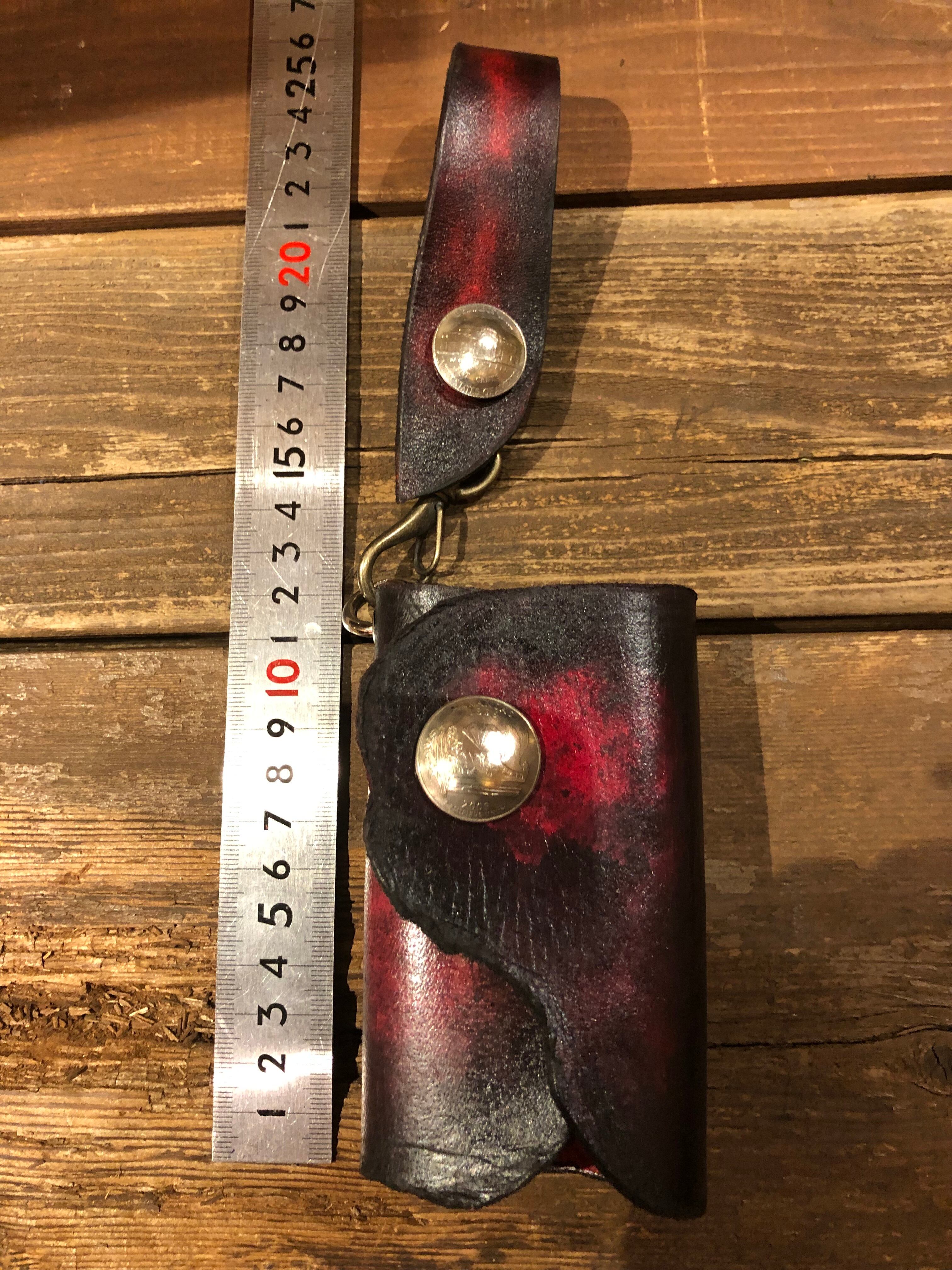 硬いヌメ革をワイルドに加工してグラデーションに手染めしてますコンチョはアメリカコイン2003年、キーケース金具4連で仕上げてます。ベルトループ付きですサイズ横約7cm縦約12cmマチ約3cmです。写真が現物です良くご覧になられお求め下さい。