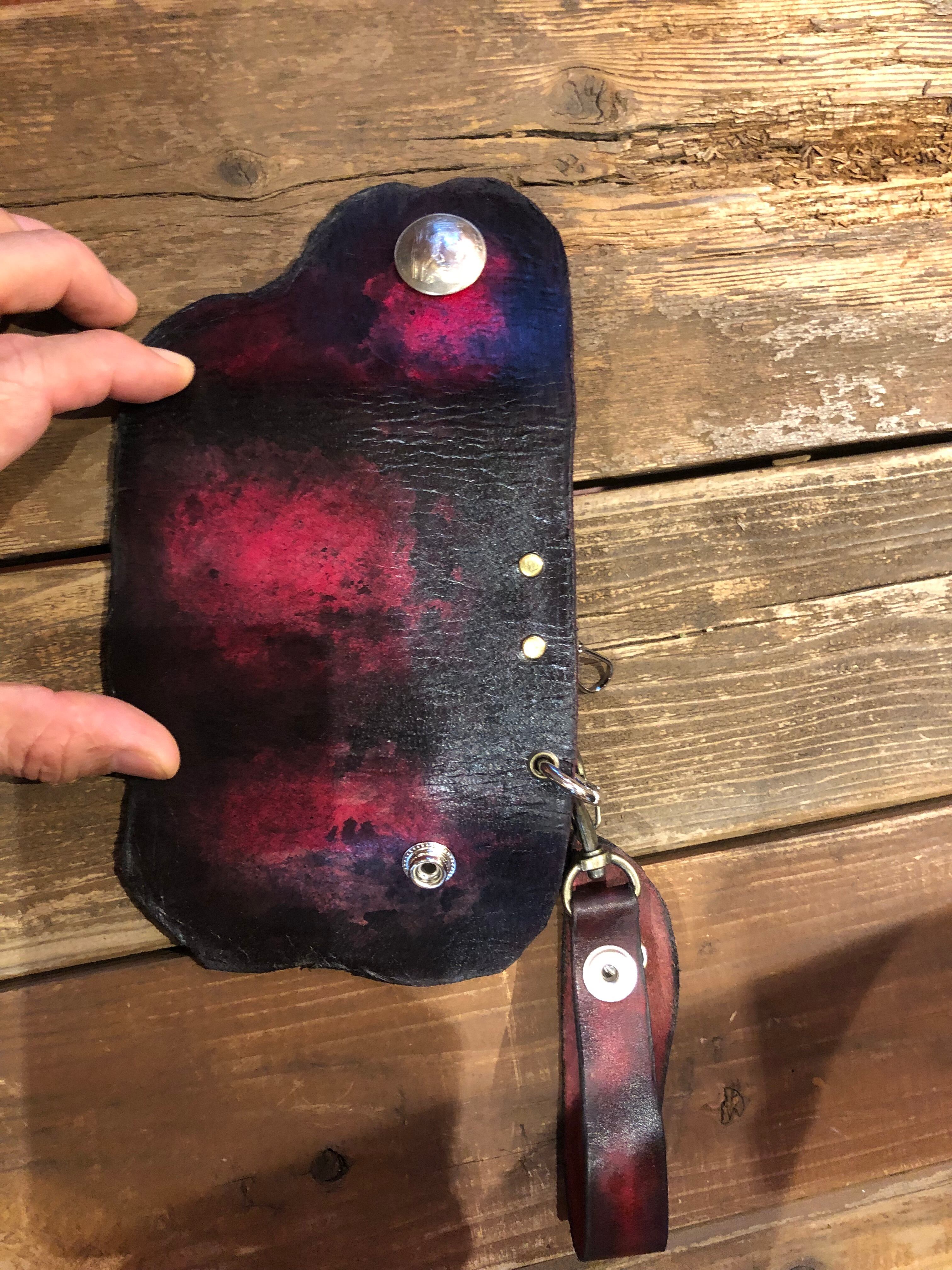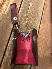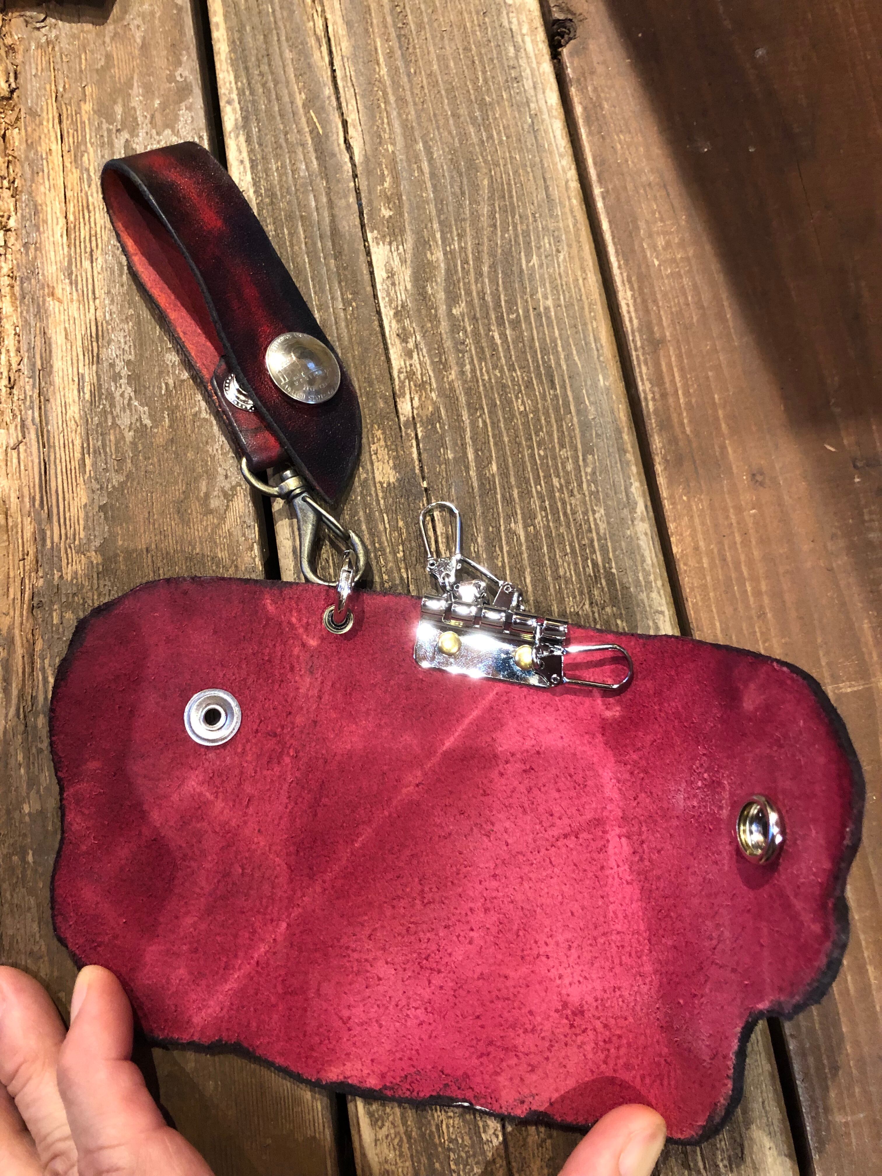 三つ折りコンチョ付きキーケース(手染め)グラデーションベース赤ベルトループ付き