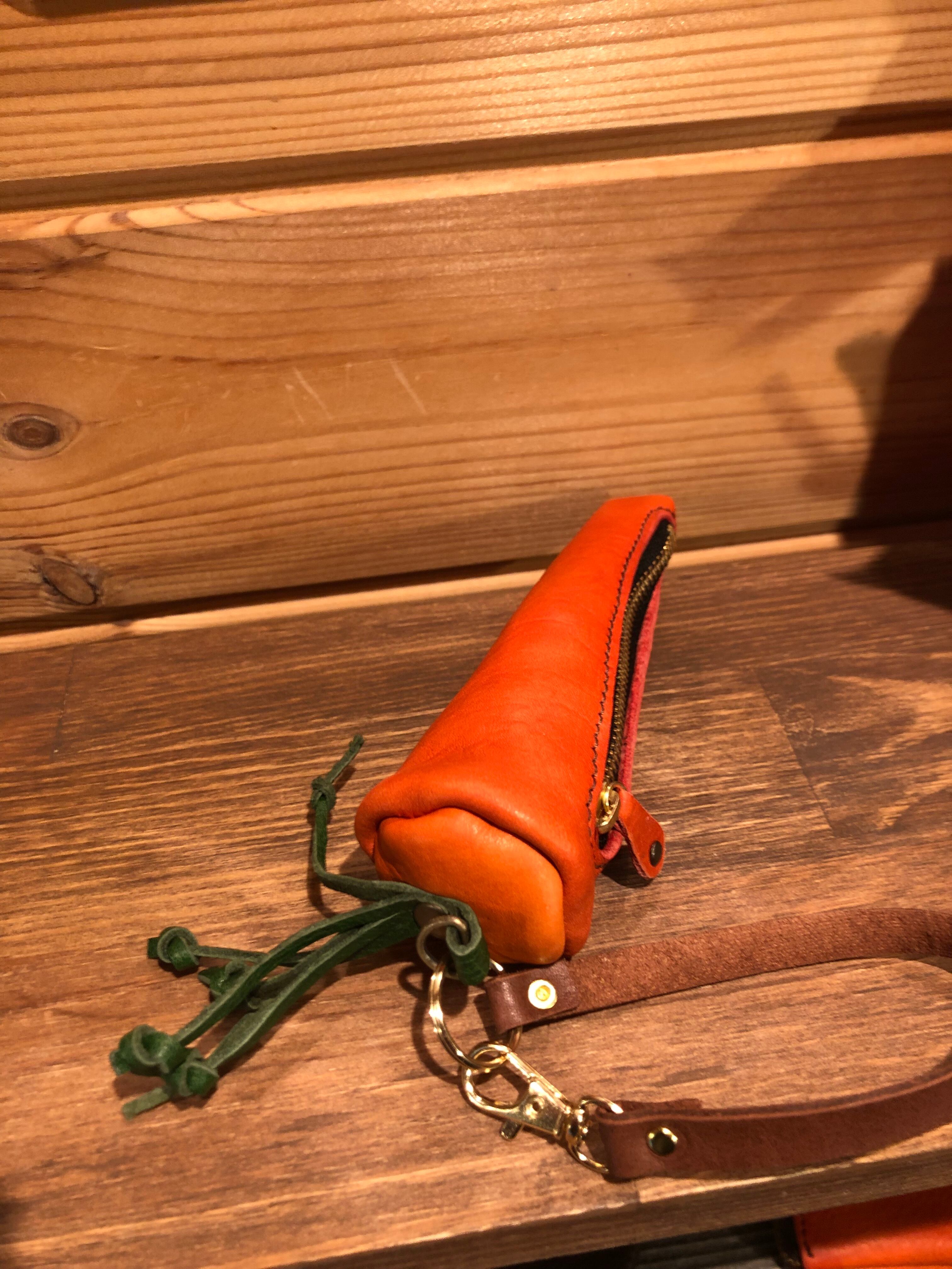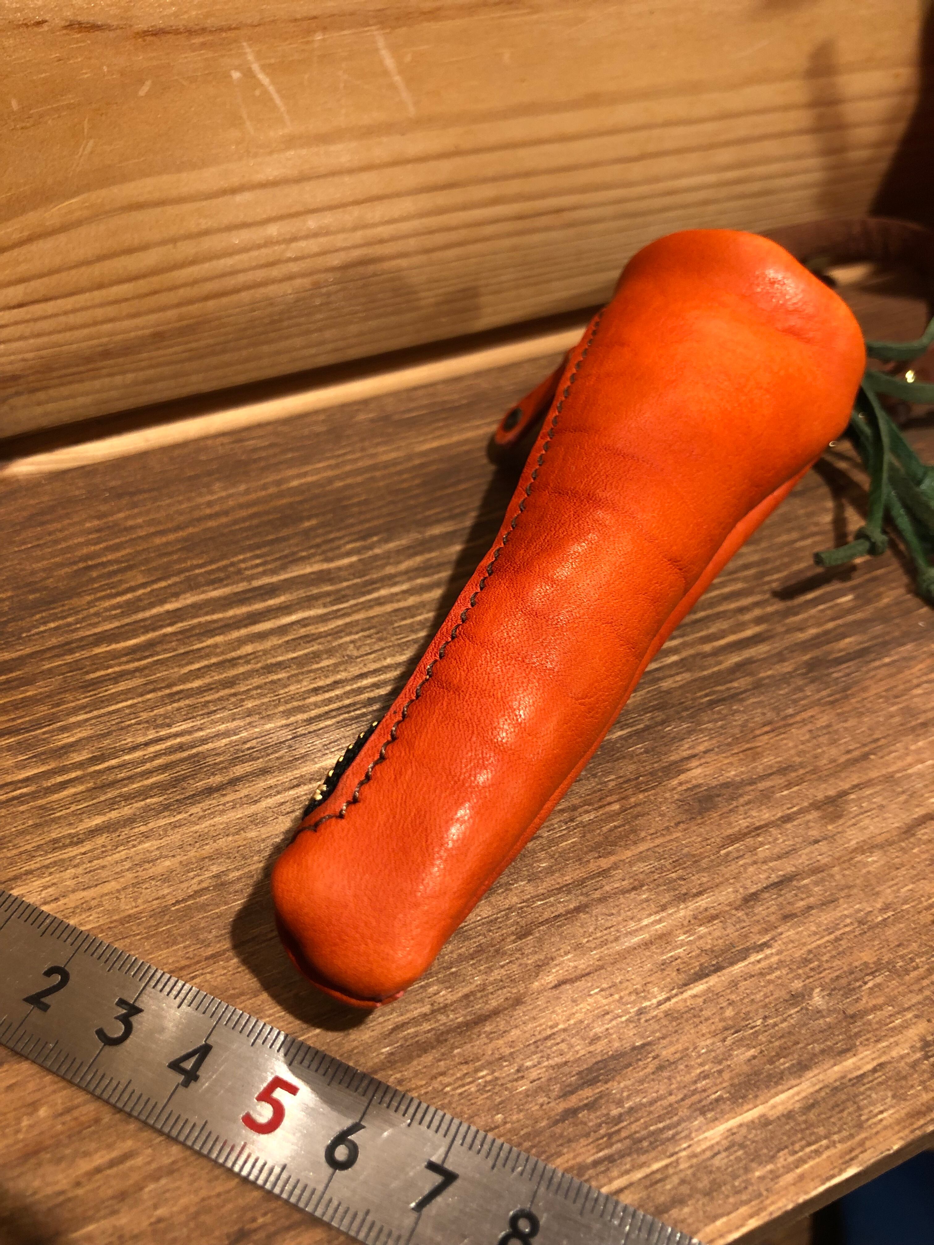 オレンジ色の柔らかい牛シュリンクレザーで作っています。サイズが縦横約13cmマチが5cm〜3cmです。写真が原物です。革なのでシワ(シボ)にも個性がありますのでよろしくお願い致します。コインはこれ以上入りそうです参考までに。(コインが写っているにんじんポーチは同じサイズの別のにんじんポーチの写真を使い回ししています。)